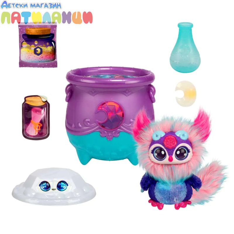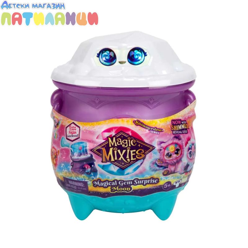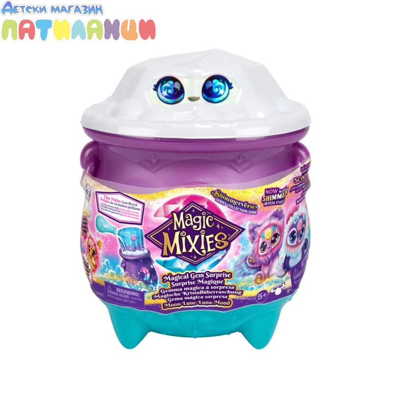 Бъди изумен какво магически се появява от твоето котле, след като добавиш магическите съставки и изречеш магическото заклинание! Добави вълшебния прах, дай име на твоето Микси със свитъка за именуване и след това налей вода с включената пръчица! Гледай как се разгръща магията, докато твоето котле бълбука и шупва преди магическо разкритие! Виж как скъпоценен камък изскача, за да разкрие твоето микси на елементите - силата на луната е в твоите ръце! Натисни кристалния скъпоценен камък на челото му, за да видиш красив блестящ ефект в очите на Mixie, когато го движиш напред-назад.