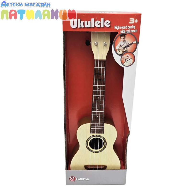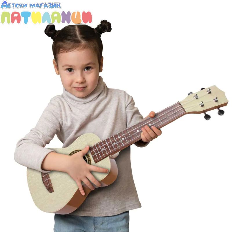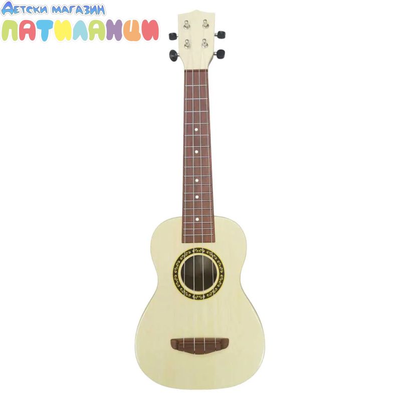 Укулеле с класически дизайн. Има четири найлонови струни и високо качество на звука. Перфектен за малкия любител на музиката.