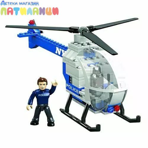 97845. Запалете светлините и се издигнете до небето, за да бъдете първите, които ще обкръжат лошите! Сглобяем хеликоптер на NYPD с отваряща се и затваряща се пилотска кабина. Много страхотно полицейско спасително оборудване и аксесоари.