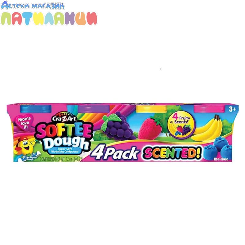 Комплектът включва: 4 контейнерчета с цветно тесто Softee dough за игра (общо 340 g).
