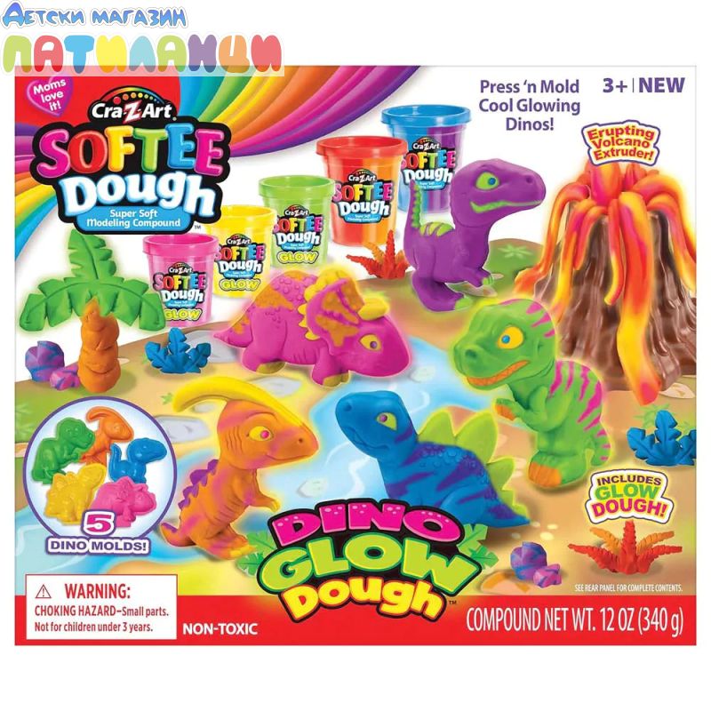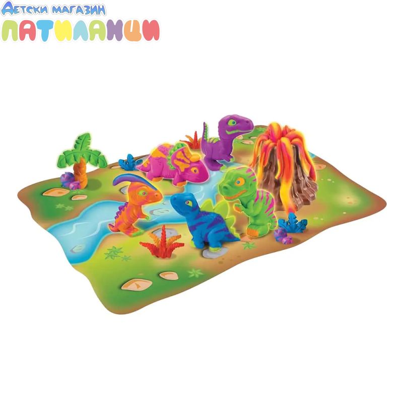 Комплектът включва: 340 g тесто за моделиране Softee Dough в 5 контейнерчета, матрица за вулкан, подложка, 5 дино-формички, ролер за оформяне, инструмент.