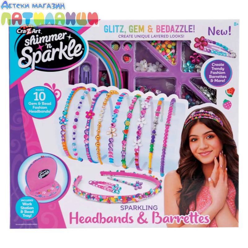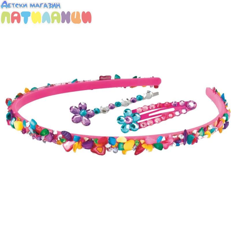 Комплектът включва: 6 пластмасови диадеми, 4 телени диадеми, 2 шноли, 2 фиби, 220 плоски и 240 кръгли мъниста, 10 мъниста – цветя, 4 мъниста – букви, лента за нанизване на мъниста 36,2 см, помощни мъниста 31 бр., инструмент с восък, поставка, лепило 5 мл.