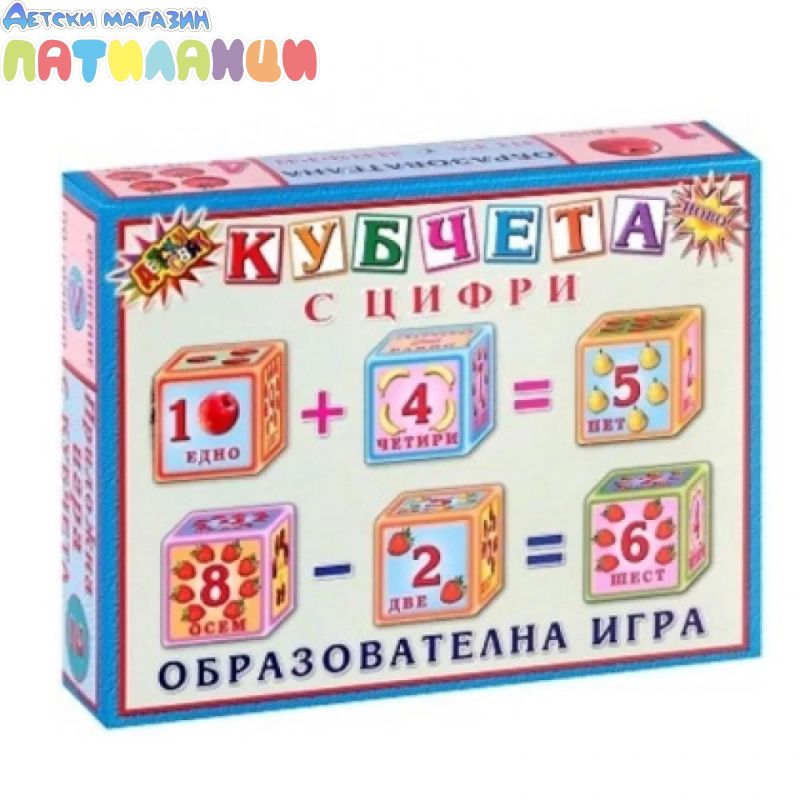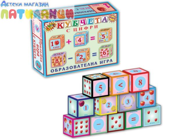 Образователният комплект от 12 кубчета, с илюстрирани цифри, знаци и картинки може да бъде незаменим за вас, родителите и възпитателите на деца от 3 годинки до деца в предучилищна възраст. Кубчетата имат за цел да ви помогнат при предварителната подготовка на детето за първи клас. Те дават възможност на кандидат първокласниците за по-плавен преход от всекидневните им игри към първите задължения на ученика. Върху дванайсетте кубчета са илюстрирани 72 цифри, знаци и картинки. Това разпределение ви дава възможност да извършвате различни аритметични действия.