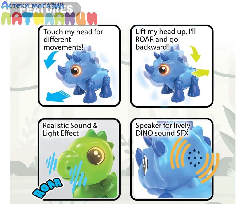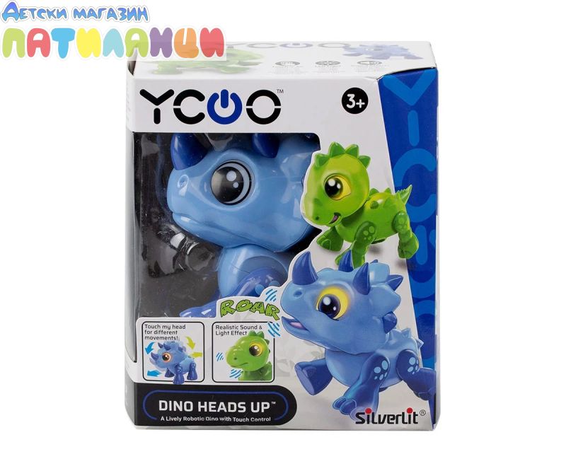Dino Heads Up™, интерактивен Дино, който идва и си отива с едно докосване! Натиснете му главата надолу, ще изревете и ще продължите напред! Вдигнете главата му нагоре, то ще изреве и ще се върнете назад!