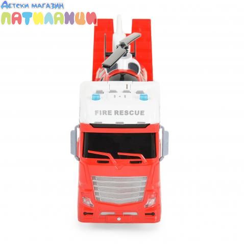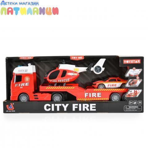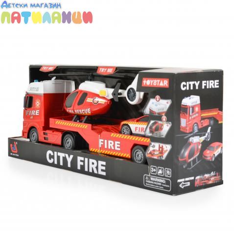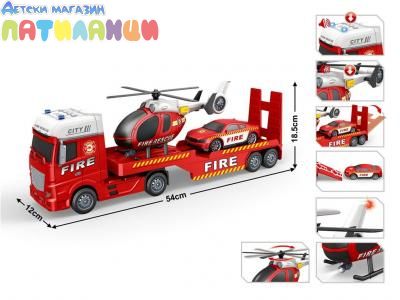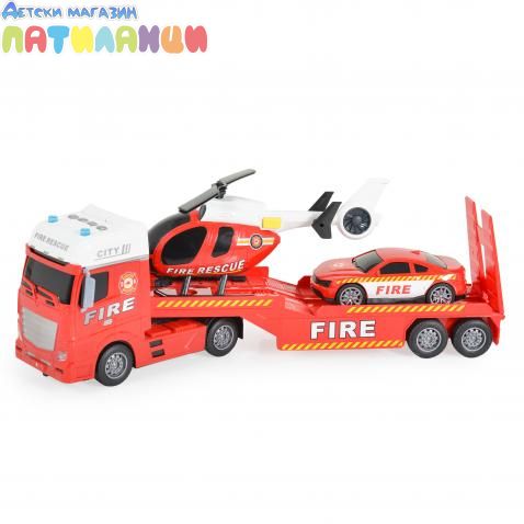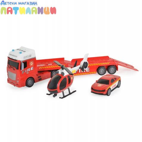 - Комплектът включва пожарен автовоз, хеликоптер и кола