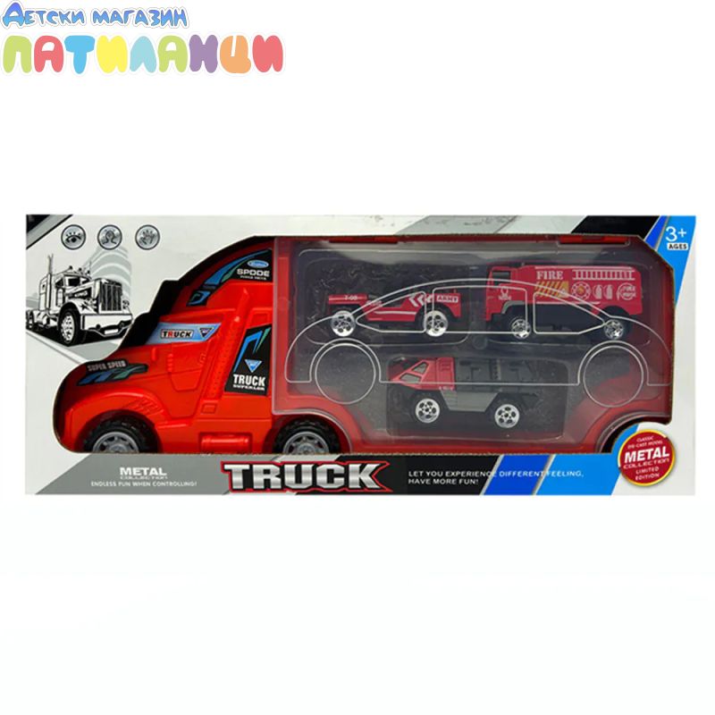 Този камион/автовоз се предлага с 3 пожарни подвижни превозни средства, включително пожарен камион, които могат да бъдат съхранявани и преместени към следващото действие. Страничният капак на автовоза се отваря.