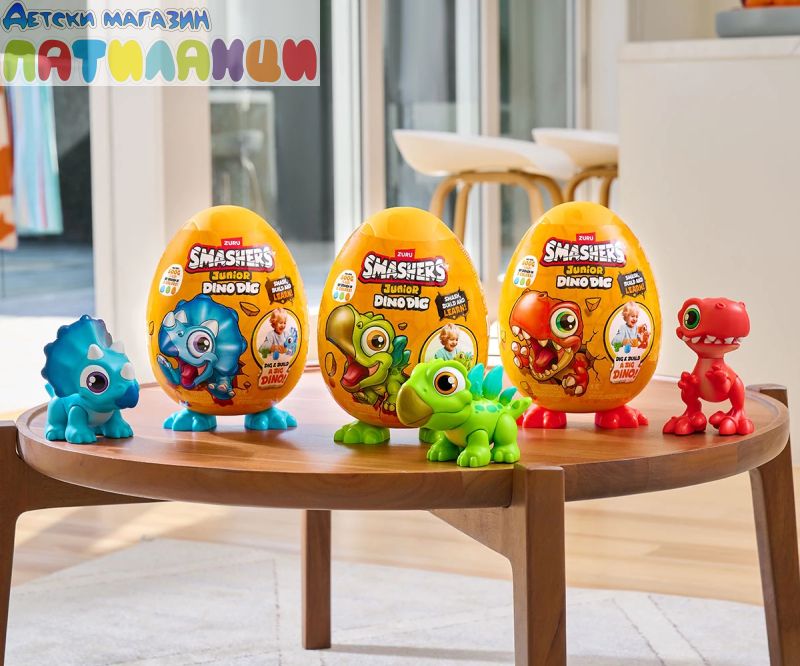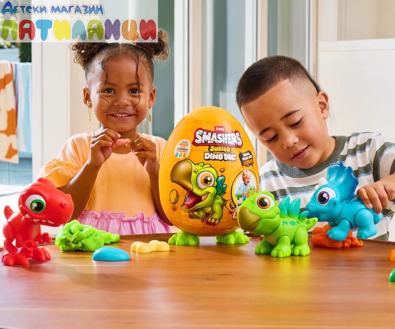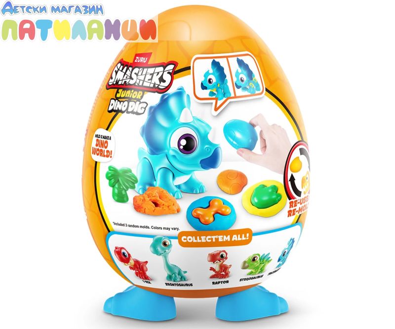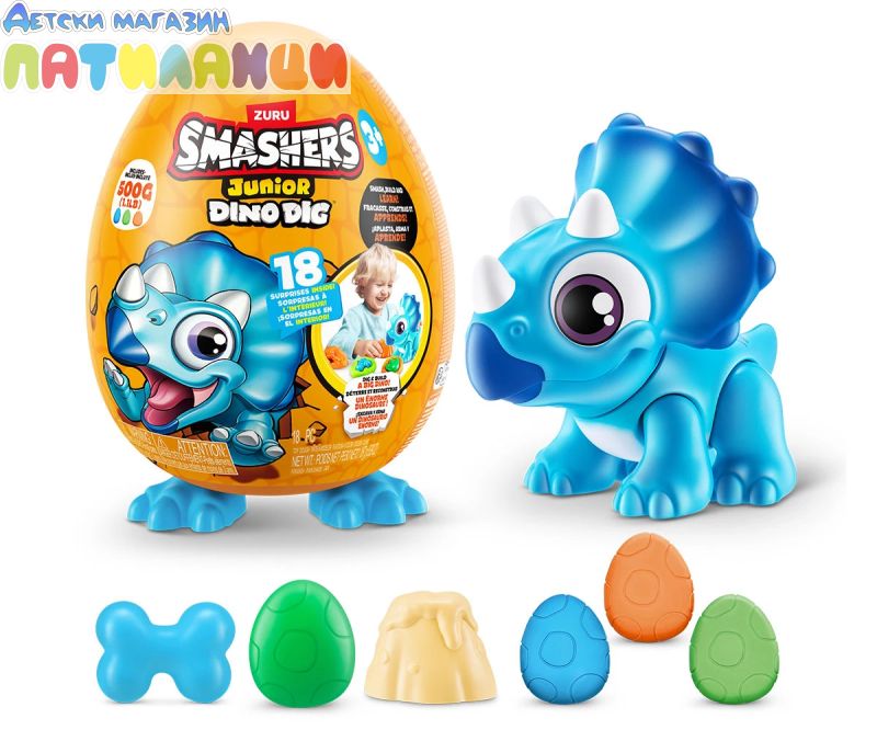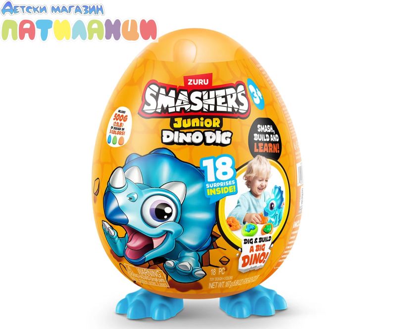 Smashers Junior Dino Dig е ГОЛЯМОТО приключение за малките изследователи. Вашето мъниче ще обича да рови в мекия дино пластилин и да открива скрити части от динозавър. Така то ще свърже частите и ще създаде своя нов приятел Дино. Има 18 изненади в това очарователно яйце, включително 3 формички за оформяне на дино пластилина! Smashers Junior е най-добрата сензорна играчка за игра и е невероятна за развиване на крайните двигателни умения на малки деца. Започнете своето приключение днес със Smashers Junior – Разбивайте, изграждайте и учете!
