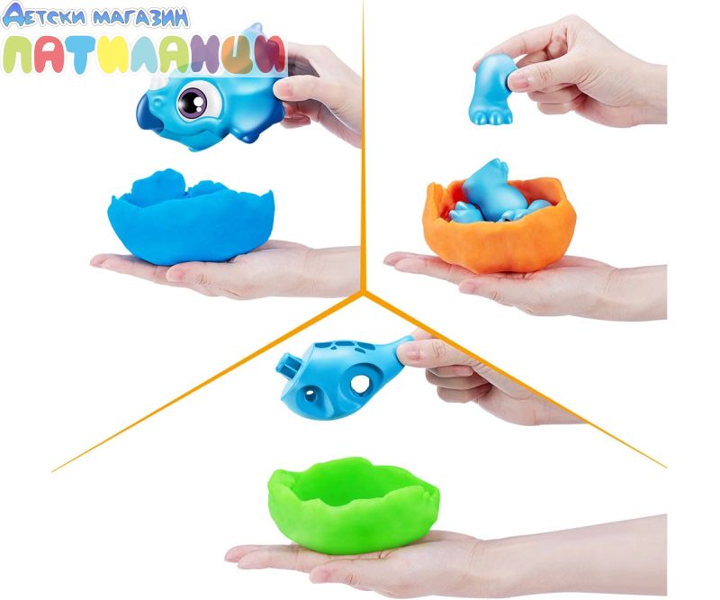 Има толкова много изненади за изследване, включително 3 цвята пластилин, 3 формички, стикери и изключително сладък Дино!