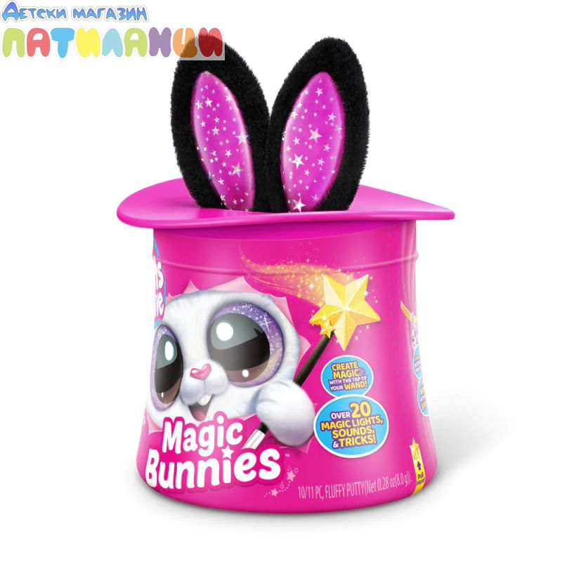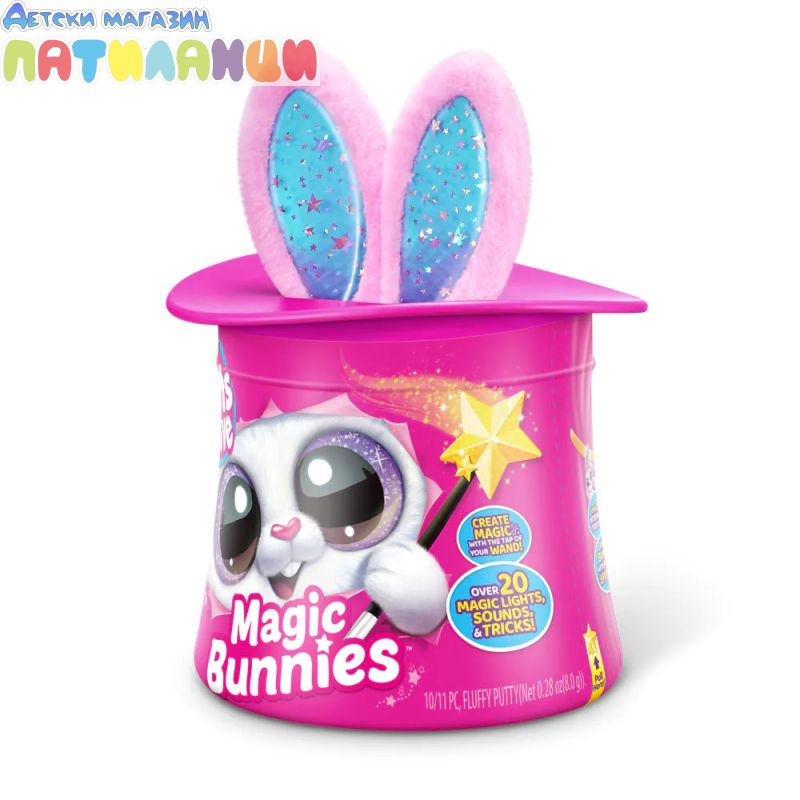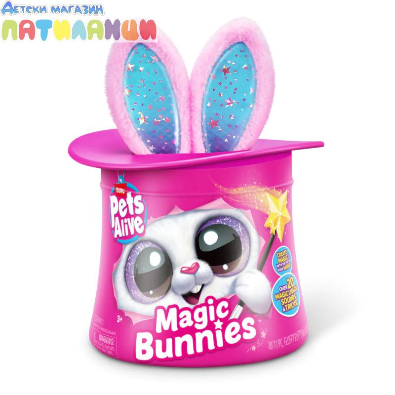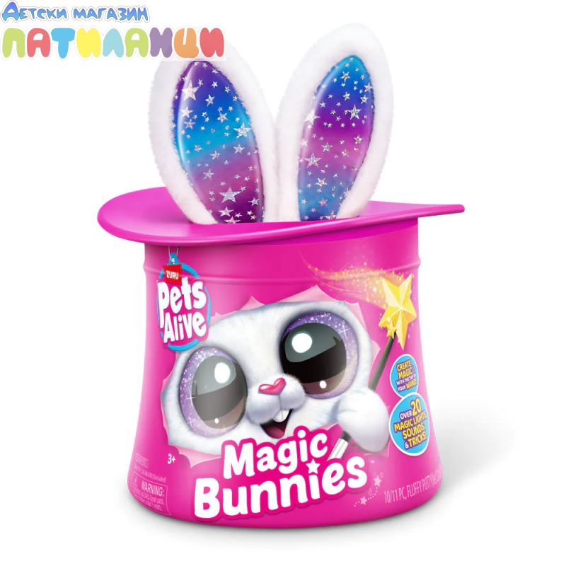 Абракадабра! Запознай се с твоя най-сладък нов магически асистент с Pets Alive Magic Bunnies. Размахай очарователната си звездна пръчица, за да видиш как ушите на зайчето светват и магията започва... Слушай мистериозните звуци на заклинанието! ТА ДААА...Издърпай твоето зайче и виж как изскачат конфети. Кое магическо зайче ще извадиш от цилиндъра - черното, розовото или бялото? Цели 3 за събиране, всяко се продава отделно. Открий тайното отделение - колко вълшебни мини зайчета ще намериш скрити вътре? Всяко зайче идва със собствен уникален магически трик!