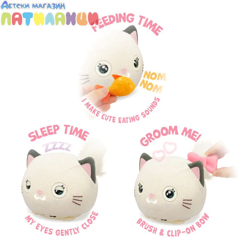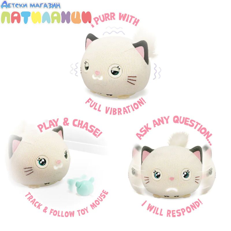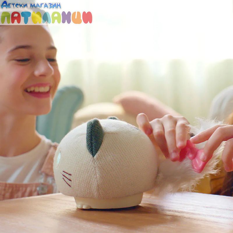 С над 75 различни мяукания, мъркания и звукови ефекти, Purro е изпълнен с индивидуалност. Оформяй опашката му с включените четка и панделка и избирай от седем режима на игра, включително изпращане на целувки, следване на играчката му, танцуване с музика, пеене в "мяукане" и отговаряне на въпроси. Няма нужда от приложения, Bluetooth или WiFi.