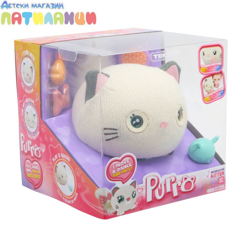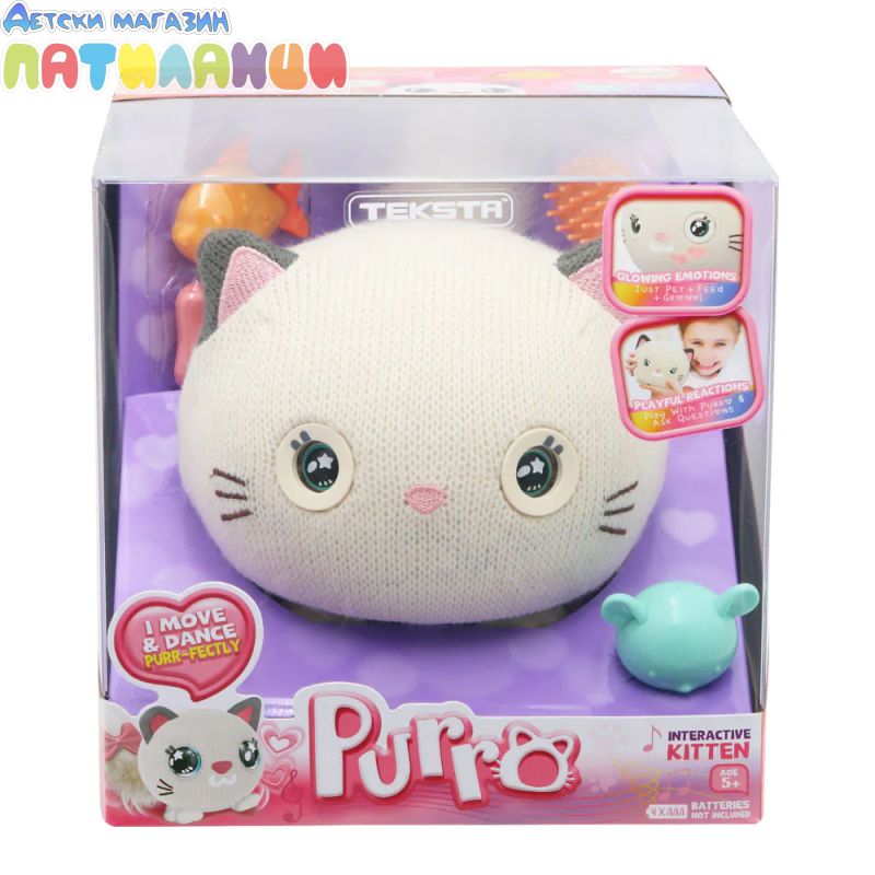 Purro е интерактивно умно коте, което е неустоимо гальовно с меката си плетена материя. Purro реагира на допир, звуци и музика, движи се и мяука като истинска котка. Нахрани Purro с неговата магнитна рибка, гледай го как гони своята играчка мишка и се наслади на неговата чувствителна на допир опашка, въртящи се уши, светеща усмивка и динамични очи.