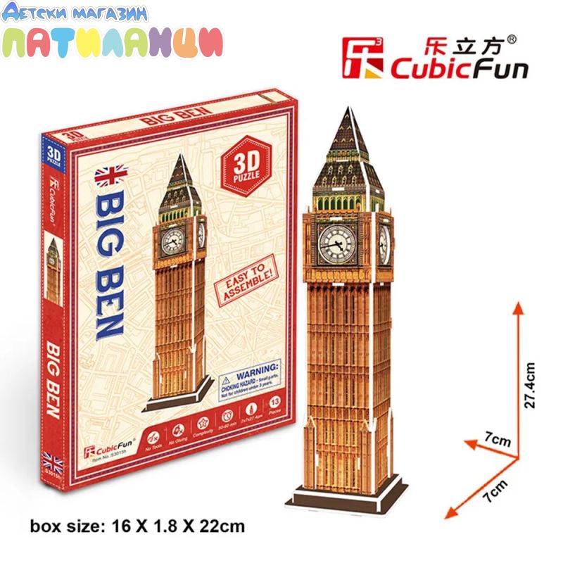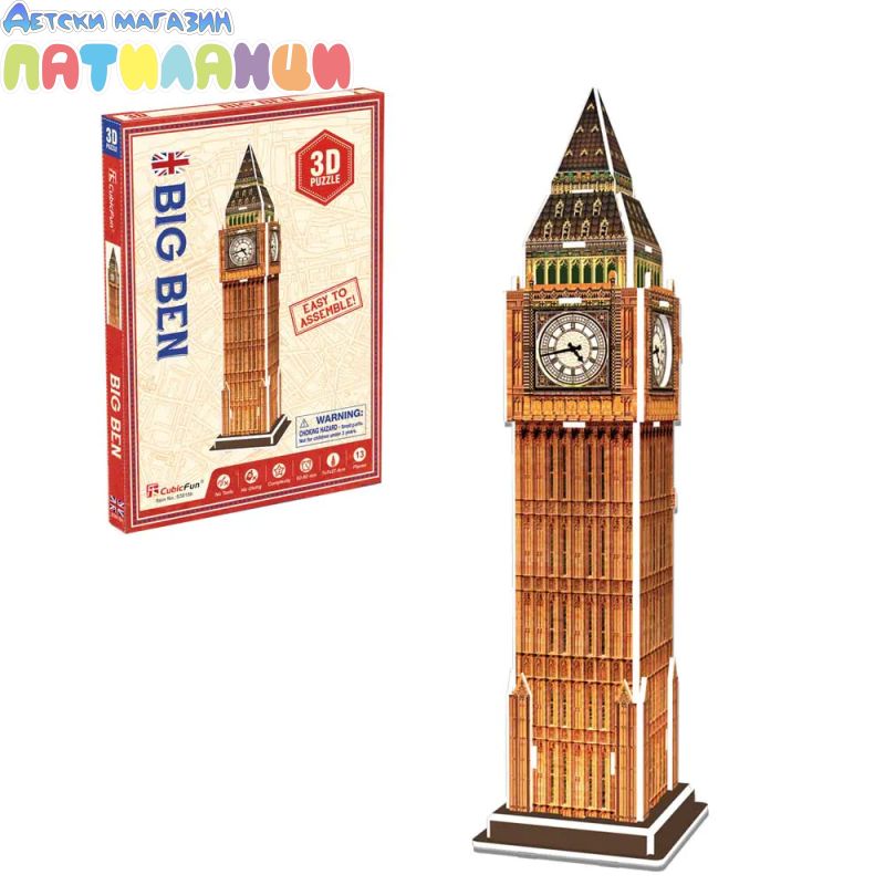 Построй Биг Бен в реалистичен мини 3D модел. 3D пъзелът развива не само логическото мислене, фината моторика, постоянството и точността, но и учи на много интересни неща за света, докато се забавляваш. А накрая ще притежаваш умален модел на една от най-емблематичните забележителности, която да използваш за декорация или за игра.