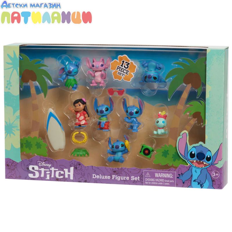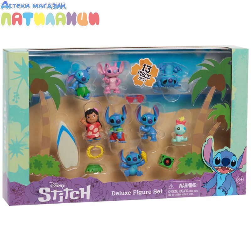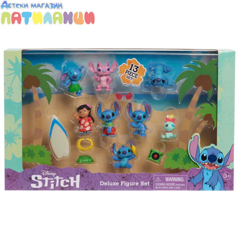 Комплектът включва: Стич в пет различни вида, Лило, Скрамп, Ейнджъл, дъска за сърф, хавайска огърлица от цветя, хула, музикална кутия и слънчеви очила.
