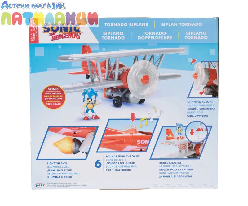 Sonic™ the Hedgehog е един от най-емблематичните герои във видеоигрите за всички времена. Насладете се на вашите приятели Tails, Knuckles и Amy, Sonic™ obikala planetata, борете се с несправедливостта и победете врага си, злия д-р Eggman. Нека да летим до небесата на Sonic с нашия комплект за играта Tornado Biplane! Активирайте класическата Sonic музика от видеоиграта, като натиснете бутона. Изживейте динамично движение с моторизирани въртящи се светлини и мигащи светлини, всички със звук и ефекти. Ima dori звук от полет, докато самолетът е сив чист и ясен, и свободно се върти se kolelaa. Има 6 звука и ефекта, които могат да бъдат включени в играта! Tornado Biplane включва 6 cm фигура, а Krilat imatum е прикрепен към допълнителни фигури за безкрайни творчески възможности за игра.