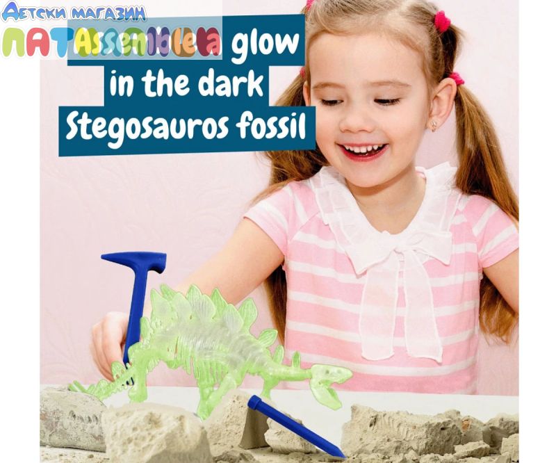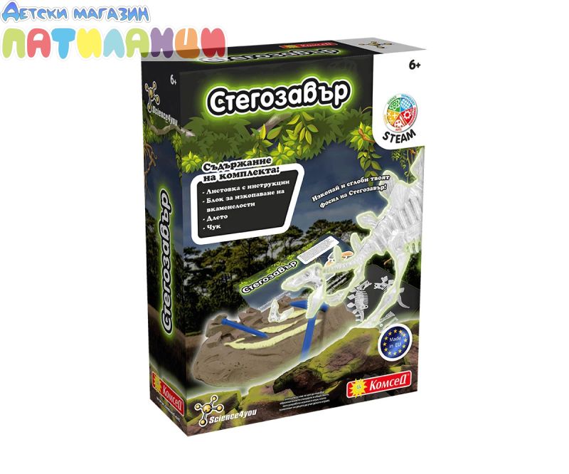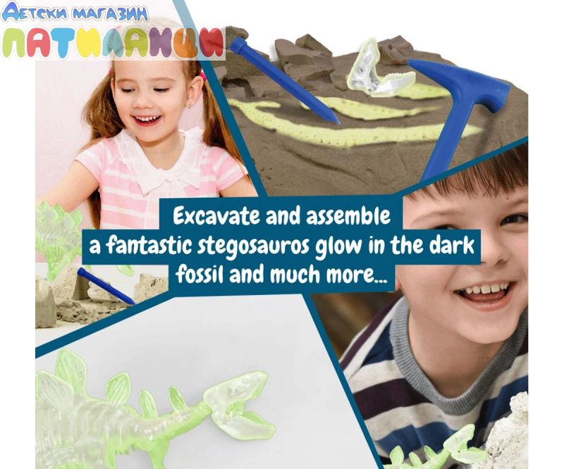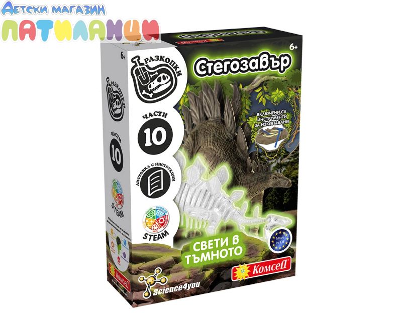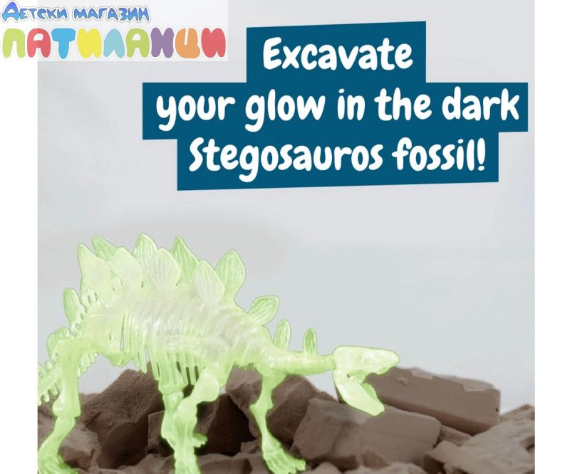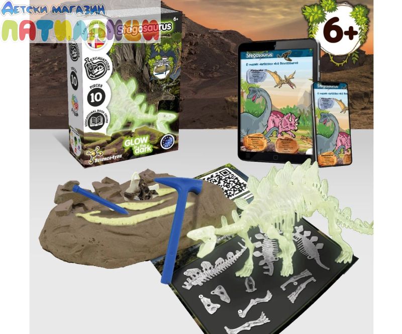 Влезте във фантастичния свят на динозаврите със Science4you и разкопайте динозавъра Стегозавър, който свети в тъмното. С този комплект ще научите най-добрите техники за разкопаване на фосила на Стегозавъра и след като искате всички части, просто сглобете динозавъра си и вижте като свети в тъмното. Перфектната играчка за всички, които обичат динозаври и Джурасик свят. Препоръчителна възраст: над 6 години. С тази играчка от Science4you ще направите първите си стъпки в света на разкопките. Ще разкопаете и сглобите своя собствен динозавър и ще видите като свети в тъмното. Удивително, нали? Открийте какво са фосилите и какво е довело до изчезването на динозаврите. Започнете това приключване на откритието и научете повече за любимите си динозаври. Включва онлайн образователно ръководство на 7 различни езика (португалски, испански, английски, френски, немски, италиански и холандски).