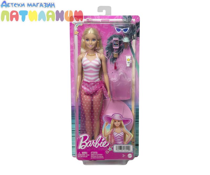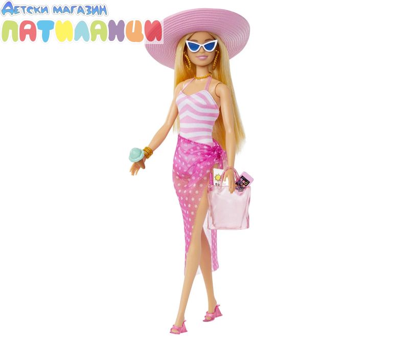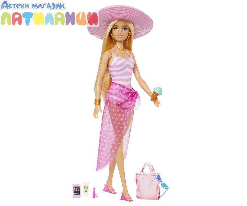 ​С крака в пясъка и сладолед в ръката, тази руса кукла Barbie® разполага с всичко необходимо за релаксиращ ден в Малибу! Тя носи летен розов комплект бански и носи чанта, пълна с плажни аксесоари. Куклата не може да стои сама. Цветовете и декорациите могат да варират.