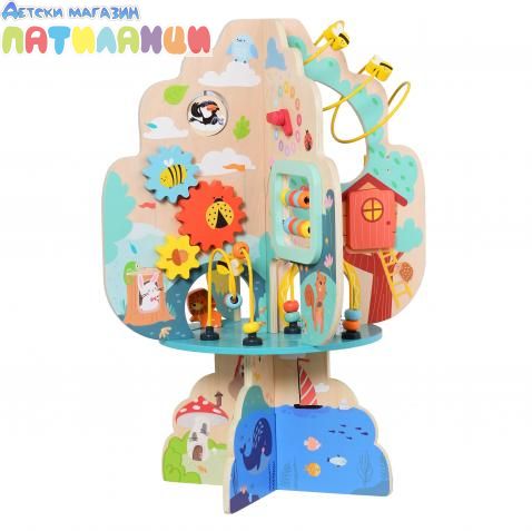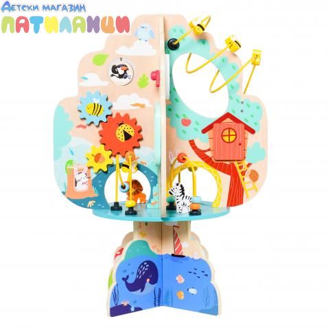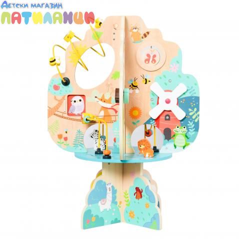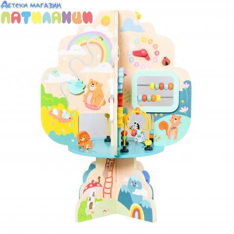 Тази дървена играчка с активности е не само красиво допълнение към детската стая, но и инструмент за развиване на когнитивните умения на детето.