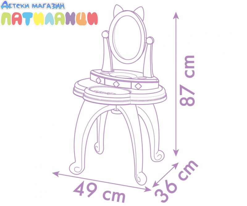 Потопете се в магическия свят на Gabby's Dollhouse и изживейте вълнуващите приключения с очарователните приятели на Габи – Панда Пау и сладките котенца! Открийте магическия фризьорски салон Gabby's Dollhouse от Smoby. Малките кралици на красотата могат да седят на удобния стол и да стилизират косите си заедно с приятели, братя и сестри. Здравата масичка за грим е проектирана в стил популярен сериал "Gabby's Dollhouse" и разполага с въртящо се огледало и три чекмеджета за съхранение на аксесоари. Включените аксесоари включват гребен, колиета, два лака за нокти, две червила, спирала, гривна, два пръстена и две кутии. Масичката Габи може да се отдели от краката и малко може да се използва и като плот. Фризьорският салон Smoby е изработен от висококачествени материали във Франция и отговаря на най-високите стандарти за качество за дълготрайно и безгрижно забавление по време на игра.
