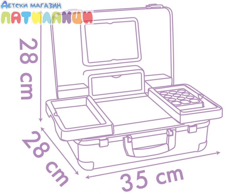 Потопете се в магическия свят на Gabby's Dollhouse и изживейте вълнуващите приключения с нейните очарователни приятели Панда Пау и сладките котенца! Козметичният комплект на Smoby в стил популярния сериал "Gabby's Dollhouse" е пълен с всичко необходимо за прекрасно уелнес лечение: независимо дали става въпрос за прическа, маникюр или грим, нищо не липсва. Всички 15 аксесоара могат да се включат в куфарчето с поддръжка и да се използват навсякъде: включване с 2 лака за съхранение на нокти, 2 червила, палитра със сенки за очи, спирала, четка, гребен, ластик за различни коси, пръстен и бутилки. Благодарение на двете закопчалки, нищо не се губи при пътуване. Куфарчето разполага и с огледало и тайно отделение: рафтовете вътре могат да се свалят, за да се създаде място за повече козметика.