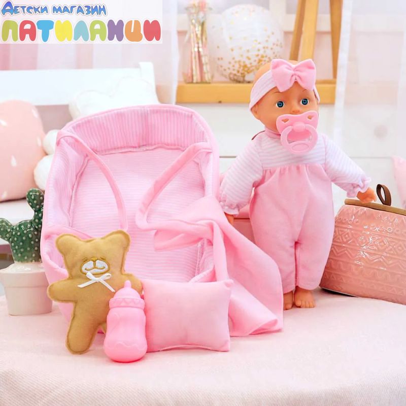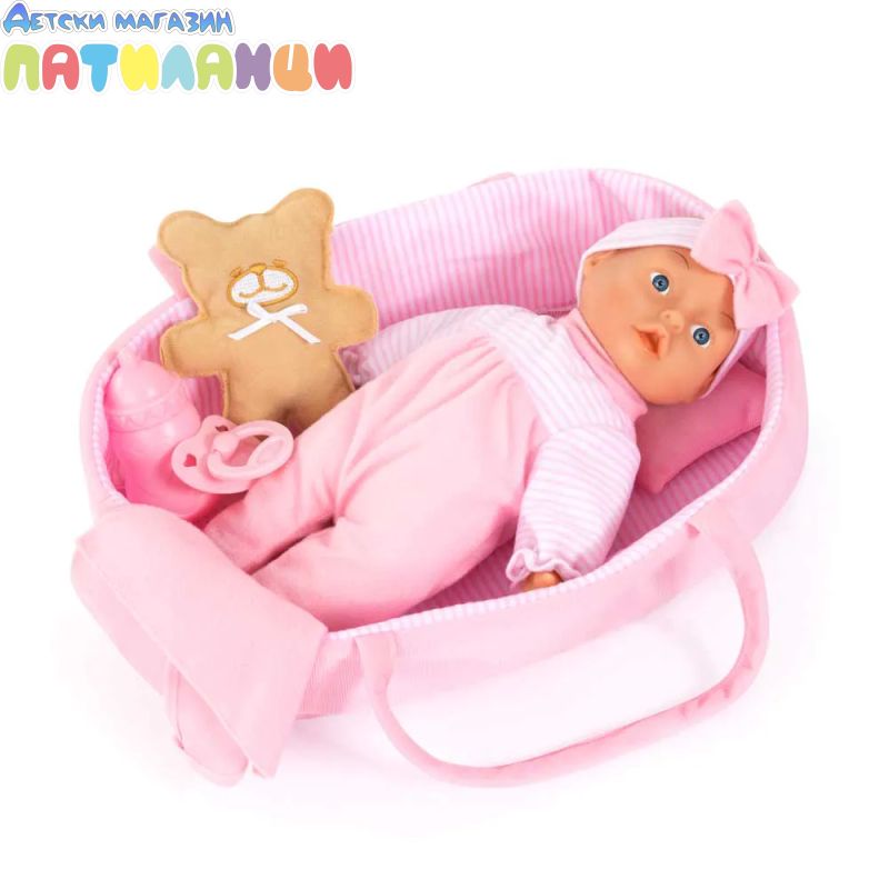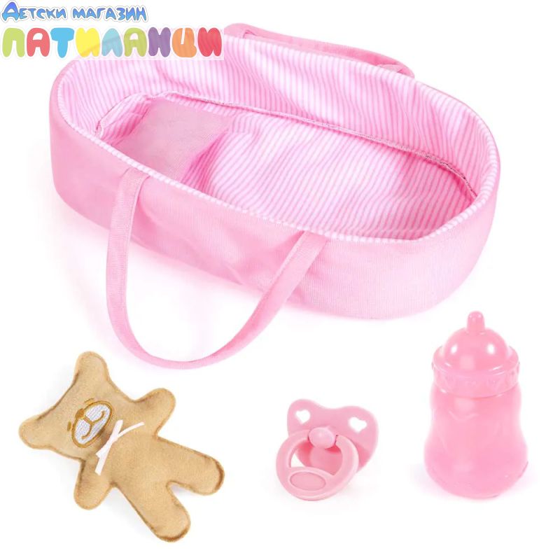 Комплект, състоящ се от кукла бебе, порт бебе за кукли, завивка, възглавничка, залъгалка, шише, плюшено мече