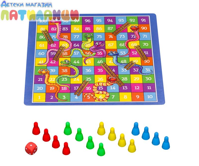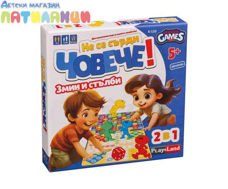 Това са две класически игри за цялото семейство! "Не се сърди човече" е забавна и състезателна игра със зар и цветни пионки. В нея може да участват двама, трима или четрима участници. Който е най-големият късметлия и първата прекара и четирите си пионки през игралното поле, и успее да го изкара до финала, той е победител. "Змии и стълби" е много забавна и интересна игра, играе се само с една пионка. Ако пионката попадне под стълбата, то се премества до върха ì. Ако обаче пионката попадне на главата на змия, се премества надолу до опашката ì. Играйте може да спечелите играта като хвърлите точното число, което е необходимо, за да стигнете 100.