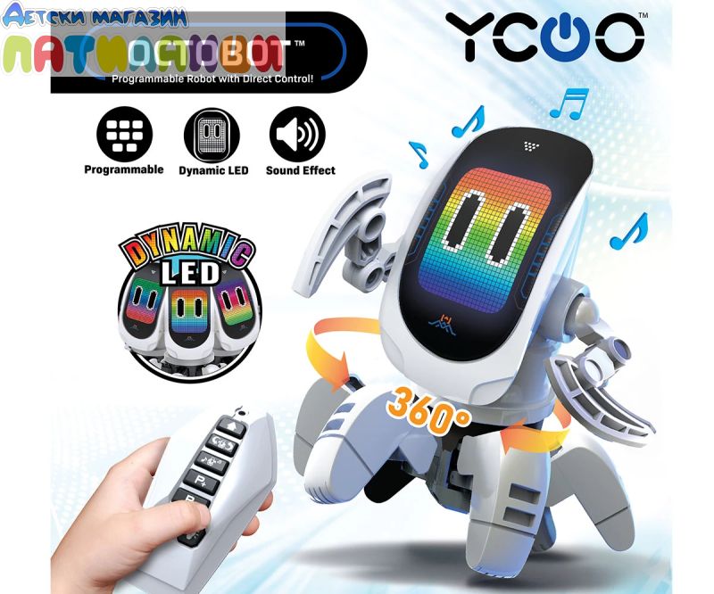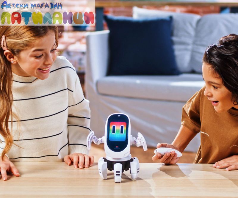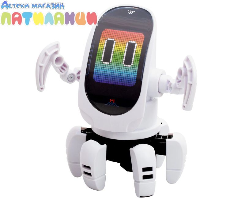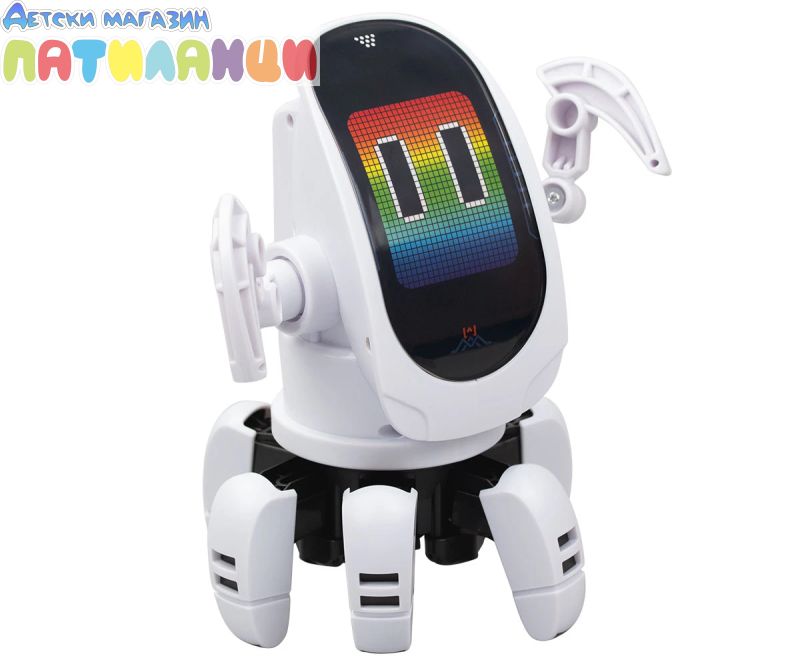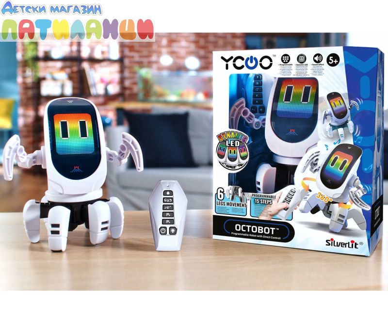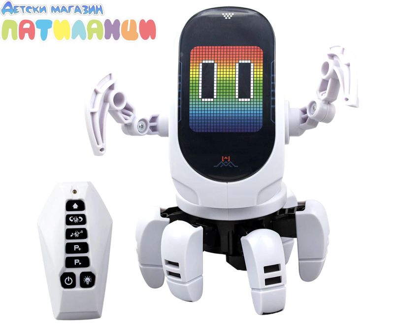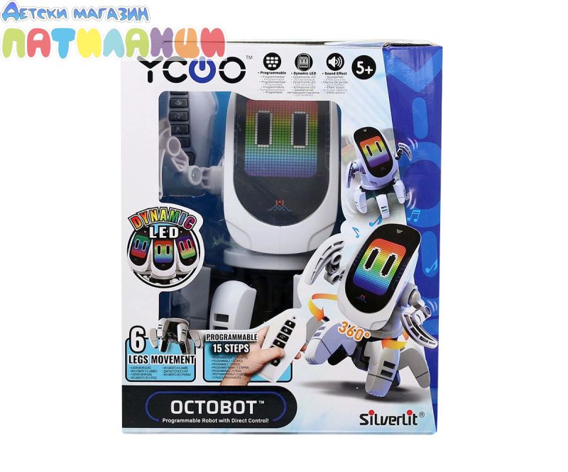 Представяме ви OCTOBOT, робот за програмиране и с директен контрол. Върти главата си има динамични светлинни ефекти. Можеш да програмираш до 15 стъпки. Върви на 6 крака и всяка стъпка е танцова или пък шега. Забавлявай се с музиката и танцувайте на Октобот. С дистанционно управление с въртене на 360° и динамично LED лице. Насладете се на персонализирани движения или завладяващо светлинно и музикално шоу (включени с 3 танцови режима).