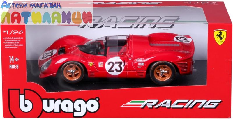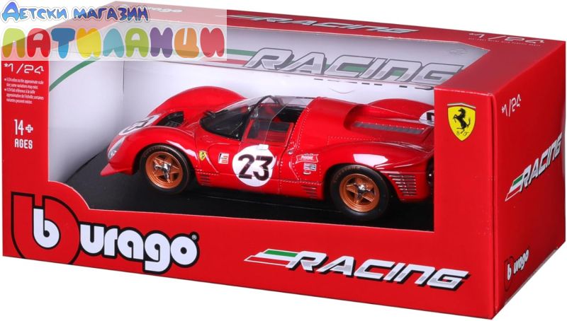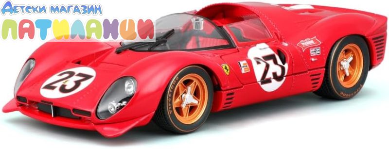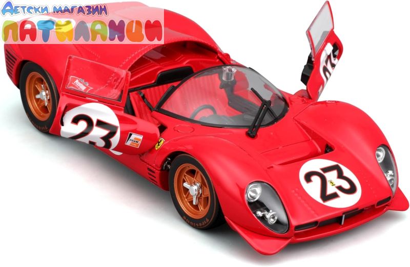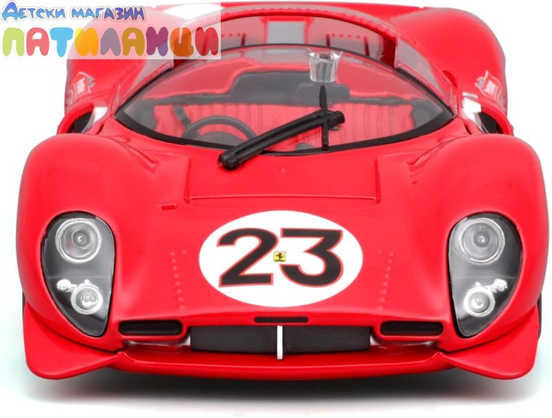 Еха! Обърнете внимание на детайлите на модела Ferrari 330 P4 Daytona от Bburago. Тази великолепна реплика на автомобила с размери 1:24 е с невероятно високо ниво на детайлност на екстериора, което го прави почти идентично с оригиналното превозно средство. Този модел е абсолютно перфектен за колекционери от всички възрасти. Добавете нотка елегантност и мощ към вашата колекция от модели с това Ferrari 330 P4 Daytona в мащаб 1:24 от Bburago. Този модел предлага невероятна прецизност към детайла и дизайн, който улавя чистата същност на този емблематичен автомобил. От предницата до колелата, всеки детайл е прецизно възпроизведен. Идеален подарък за любители и колекционери на автомобили.