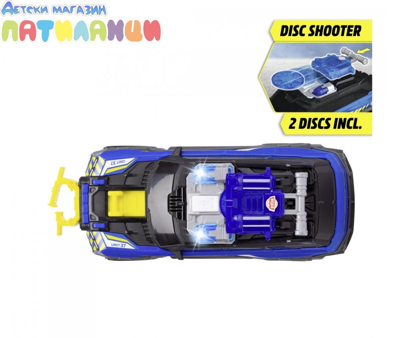 Без шанс за мошеници и престъпници: това полицейско превозно средство с висока проходимост е идеално оборудвано за вълнуващи преследвания и изпълнени с екшън мисии! Със своята функция за свободно завъртане, той се търкаля без усилие по земята и спира бягащите коли играчки с издърпващия се знак стоп. Рамото за захващане в предната част на автомобила може да се отваря и затваря с помощта на лост - идеално за улавяне на подозрителни предмети. Но най-важното е на покрива на колата: с диск шутъра малките полицаи могат да стрелят по приложените дискове с дрон и водни мотиви и да симулират смели спасителни мисии.