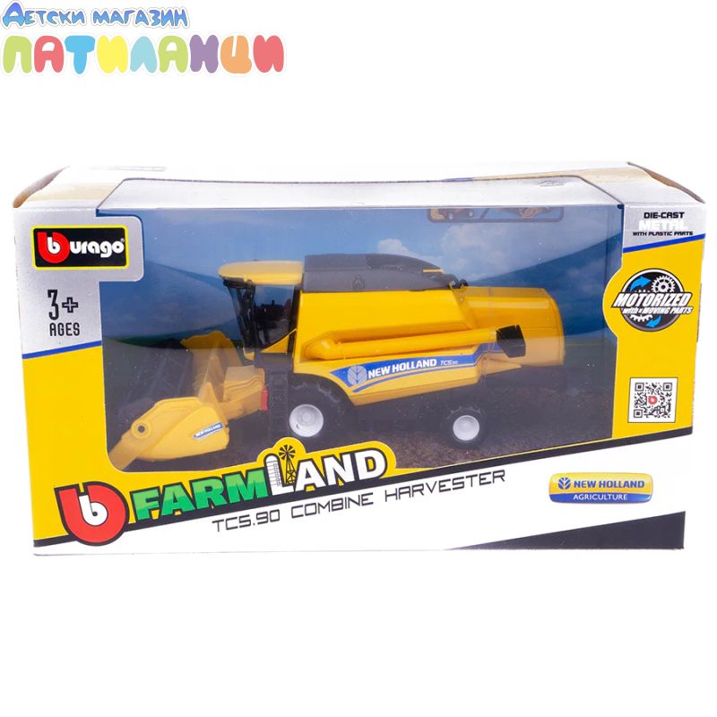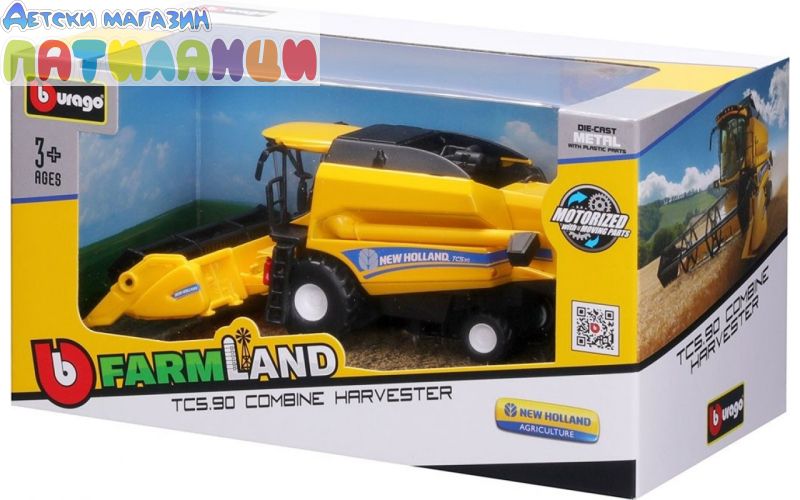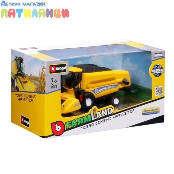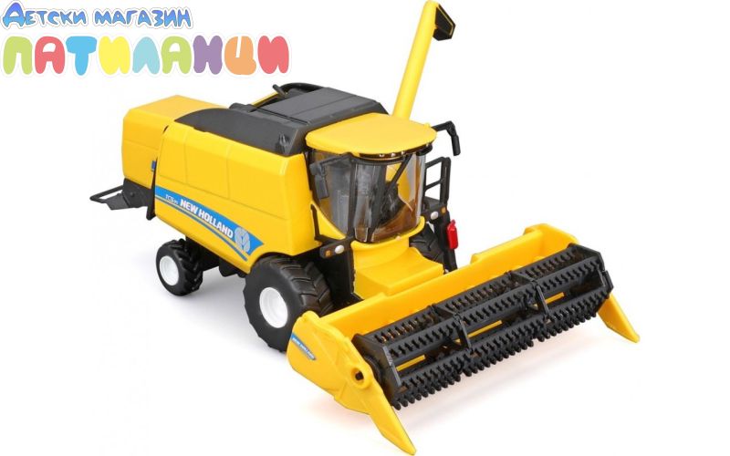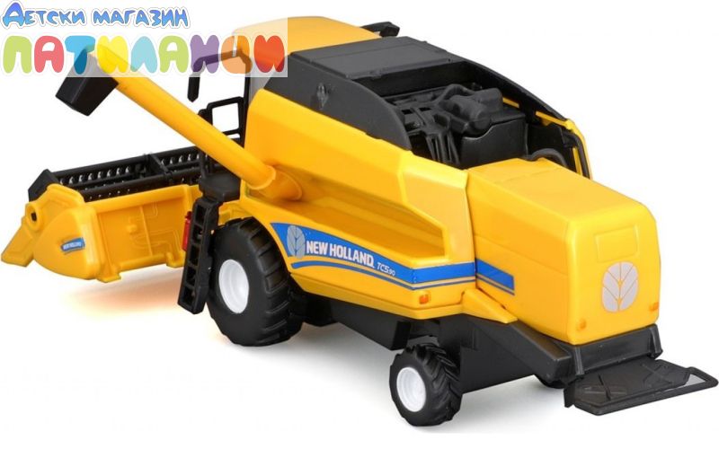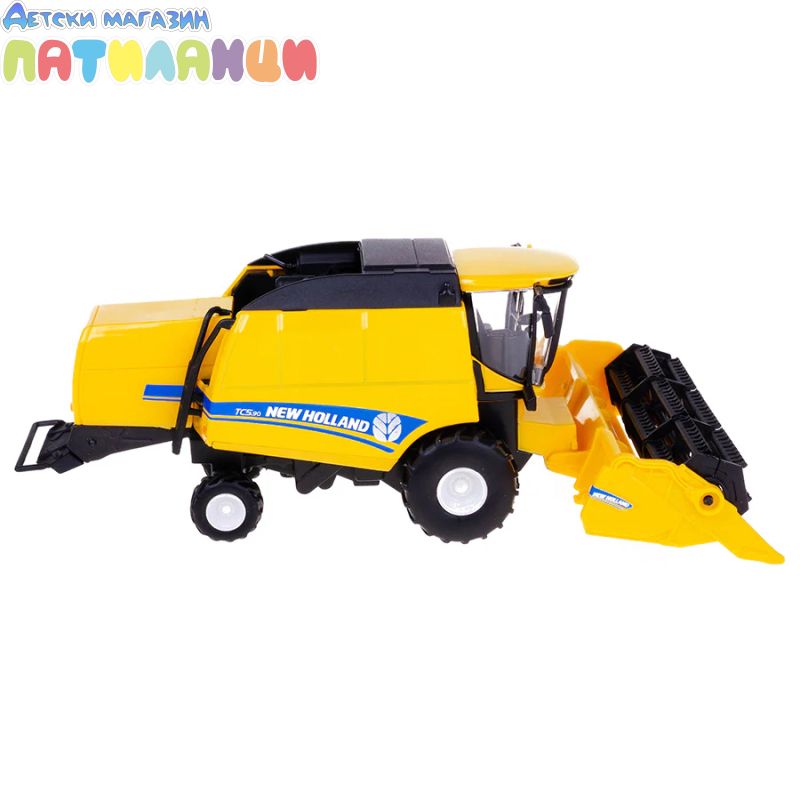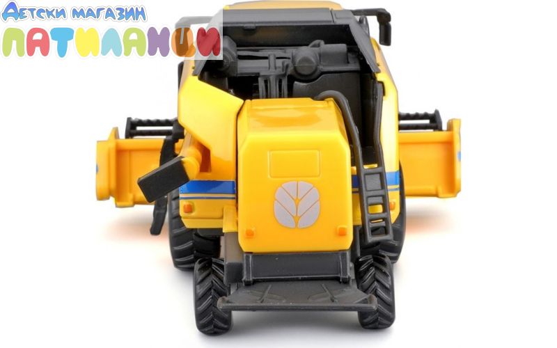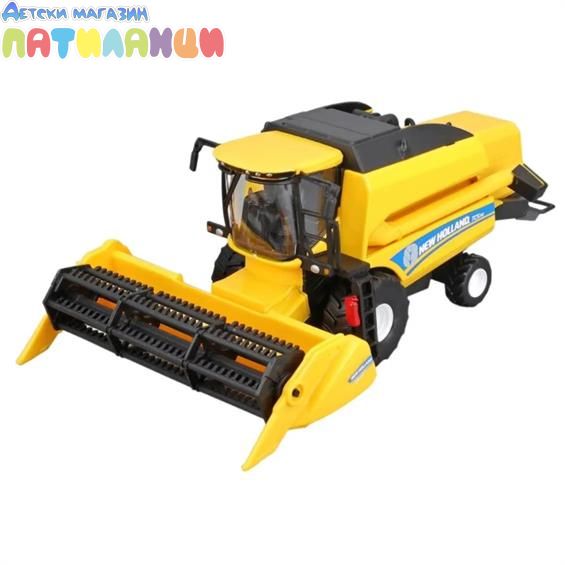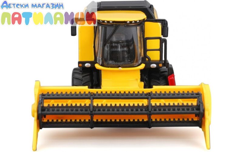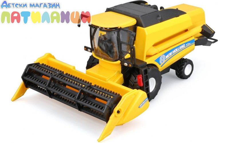 Изключително подробен лят под налягане метален модел на зърнокомбайн New Holland Tc5.90 с хедер за царевица. Жълтото шаси и калникът се намират над четири масивни колела с автентично изглеждащи гуми с дълбок протектор. В горната част на стъпалата е кабината с отворен изглед, която включва пълни интериорни детайли точно като всеки друг модел превозно средство Bburago.