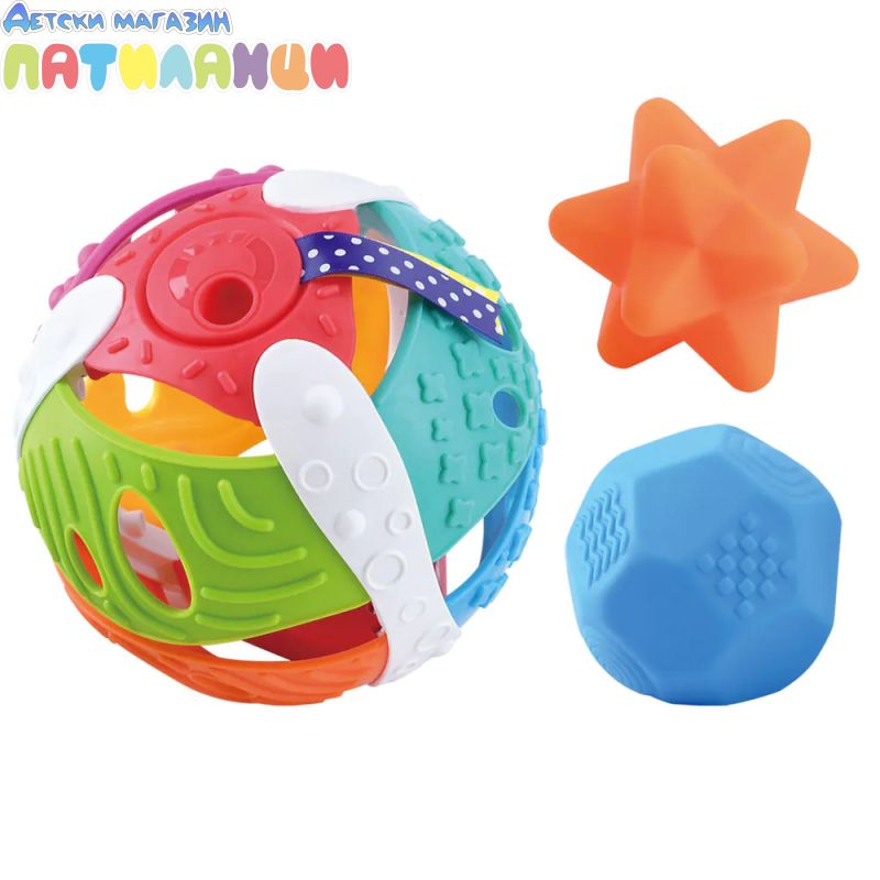 С вградена дрънкалка, тази играчка стимулира любопитството на бебетата и насърчава изследването, а тракането вътре в топката насърчава слуховото възприятие и координацията око-ръка.