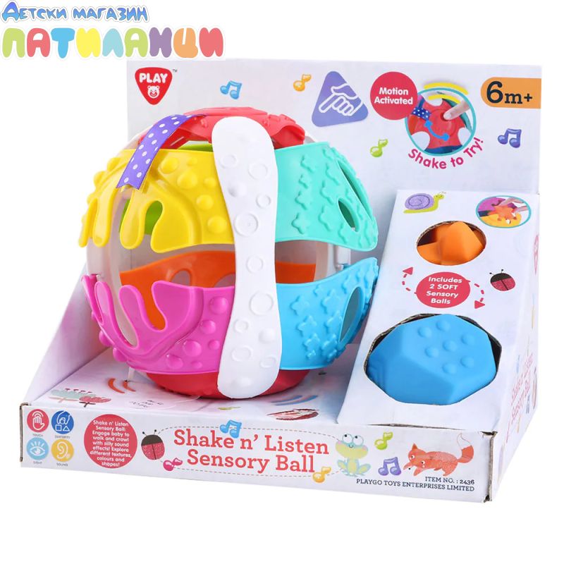 Shake n' Listen сензорната топка подбужда бебето да ходи и пълзи със забавните си звукови ефекти! Позволява изследването на различни текстури, цветове и форми! Включва лента с въртящо се колело, което издава щракащ звук. Активира се с движение.