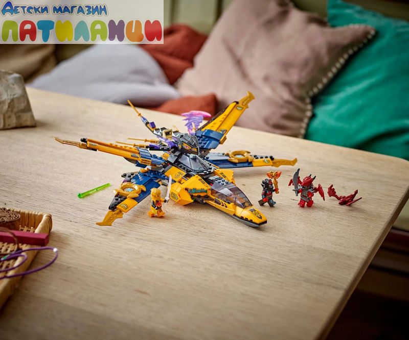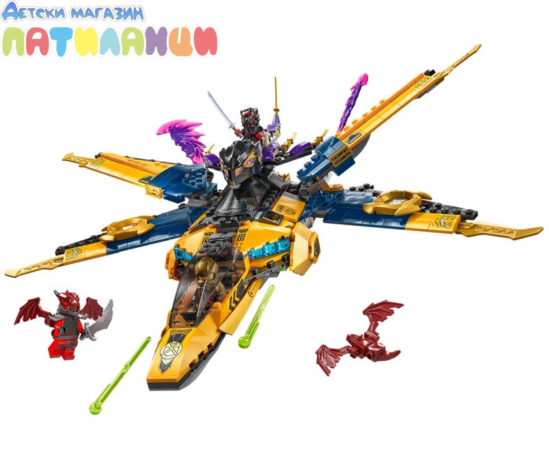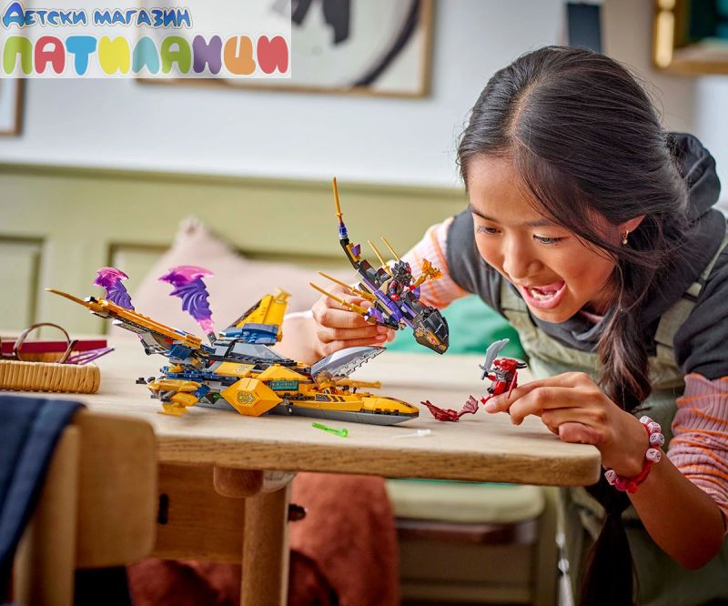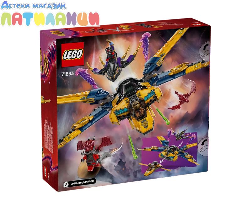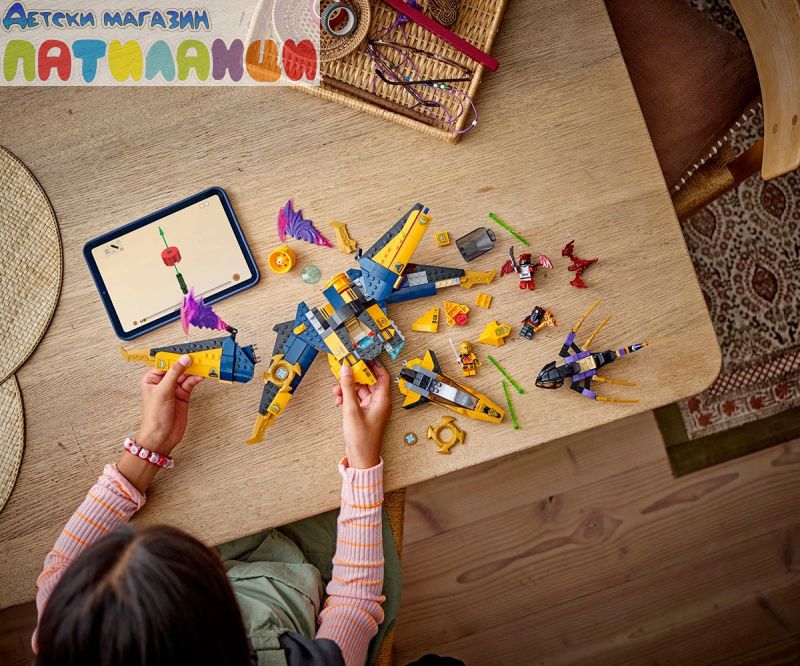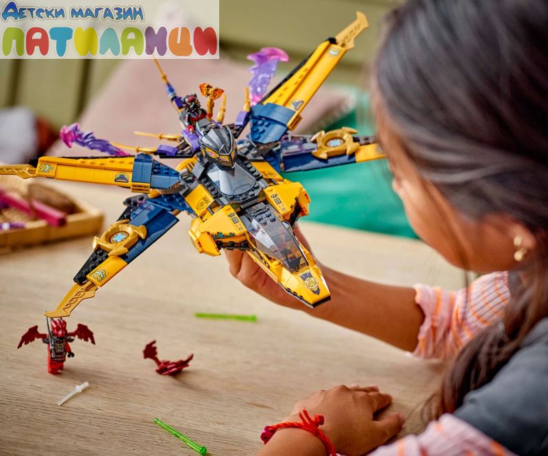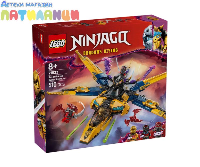 Момчетата и момичето на възраст над 8 години могат да пресъздадат сцени от сезон 3 на ТВ сериалаNINJAGO® Dragons Rising със „Супер буреносен джет на Рас и Арин“ (71833). Този невероятен строителен комплект LEGO® включва страхотен джет със свалящ се дрон и спасителна капсула плюс минифигури на Арин, Рас и Драконов воин и минимодел на дракон и се предлага на децата с всичко необходимо, за да се насладят на безброй часове ролева игра. Зашеметяващата ексшън играчка има свалящ се дрон с драконова глава с подвижни остриета и двигатели, които могат да се използват като оръжие, две пилотски кабини, включително една, която може да се отдели като летяща спасителна капсула с крила, две оръдия, регулируеми крила и въртящи се буреносни остриета. Гамата LEGO NINJAGO от строителни комплекти и нинджа играчки за конструиране за деца (комплектите се продават отделно) включва дракони, превозни средства и храмове, така че феновете да могат да разиграват ролеви приключения със своите герои. Всеки комплект за игра с нинджи може да бъде създаден с приложението LEGO Builder, което насочва вас и вашето дете в лесно и интуитивно строително приключение.