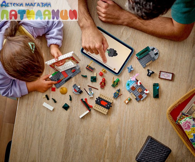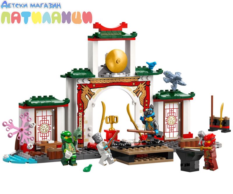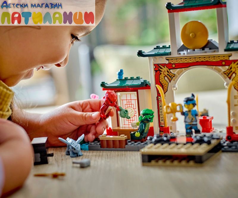 С много възможности за игра – детайлният храм на нинджите се състои от чайна, зона за тренировки с оръжие, малка градина и турнирна арена с 2 въртящи се бойни плочи;
