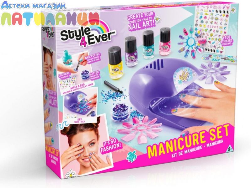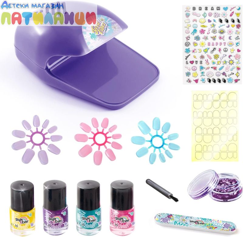 Направете свой собствен стил с този комплект за маникюр! Пълен комплект за маникюр , печка, лакове за нокти блясък , стикери.
