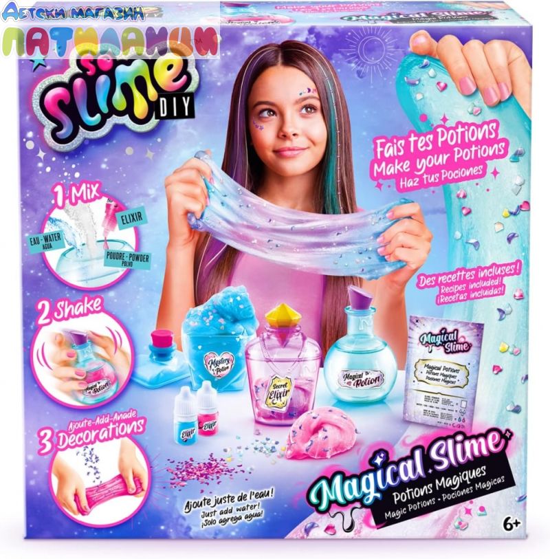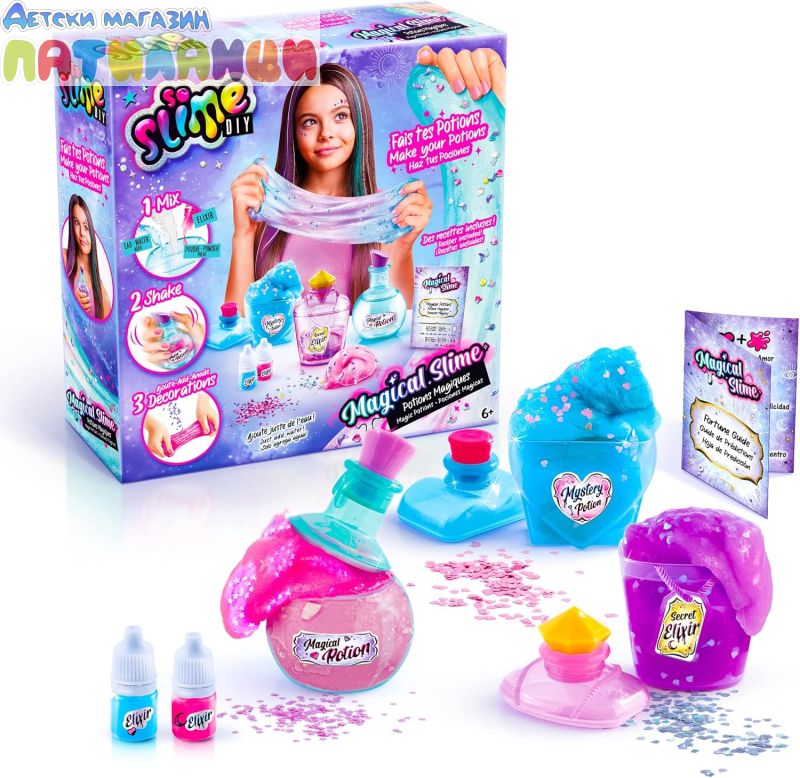Направете си въшлебни отврари от слайм. Изсипете праха, водата, цветните еликсири, декорациите и вашата отвара е готова!