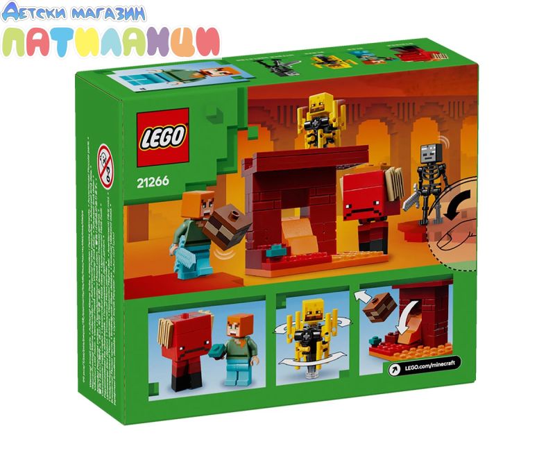 „Битка в пълнената лава“ (21266) е малък комплект LEGO® Minecraft®, който включва версия за конструиране и игра на популярната видео игра. Този универсален комплект Minecraft включва популярни фигури от играта, забавни елементи и безкраен екшън, който е идеален изненадващо за деца на възраст над 6 години. Децата се присъединяват към екшън героя Алекс от Minecraft в мисията за премахване на древни отломки от моста на пъплената крепост в пурпурната гора. Когато отломките бъдат премахнати, елементите за лава автоматично се пускат надолу, а фигурите от Minecraft – уидър скелет с каменен меч и блейз с пръчка – блокират пътя на Алекс. Децата използват емблематичен диамантен меч, за да се бият с мобовете, преди да избягат върху друга фигура от Minecraft, лаваездач с подвижни крака и седло. Играчите на Minecraft знаят, че трябва да държат изкривена гъба, за да могат да управляват лаваездача. За допълнително цифрово забавление, приложението LEGO Builder позволява на децата да обработват и завъртат модели в 3D с помощта на системата си.
