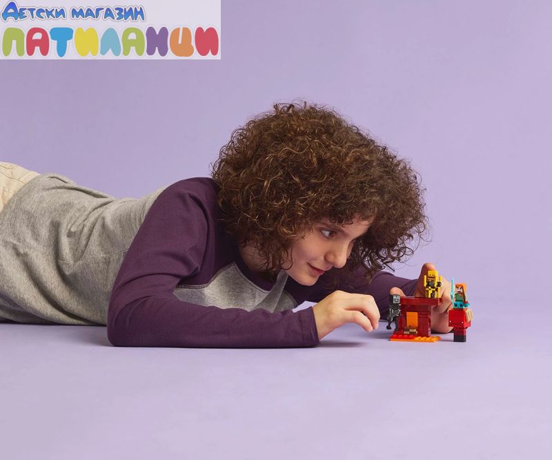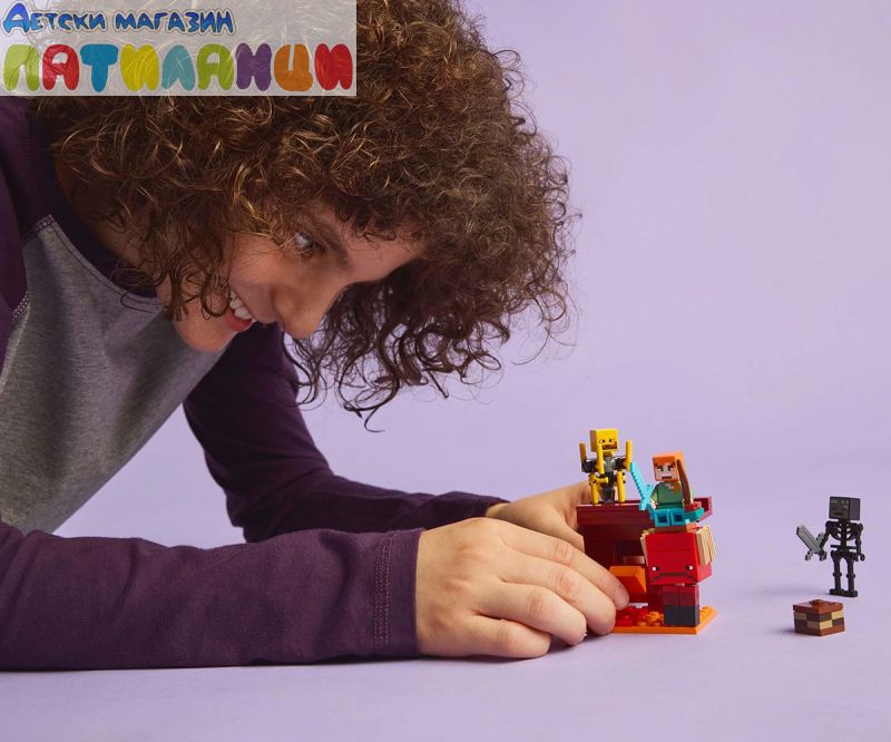 Комплект с дейности Minecraft® – включва част от моста на пълнената крепост за построяване, плюс фигури на Алекс, уидър скелет, блейз и лаваездач LEGO® Minecraft с оръжия и аксесоари;