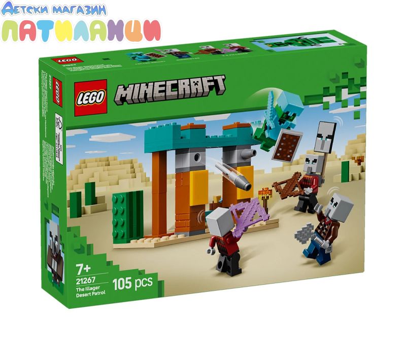 Голямо забавление очаквайте играчите на Minecraft® с този малък комплект LEGO® за деца на възраст над 7 години. С 4 фигури LEGO Minecraft, забавни елементи и автентични аксесоари, „Пустинният патрул на злобарите“ (21267) е минииграчка с мегаекшън от Minecraft.