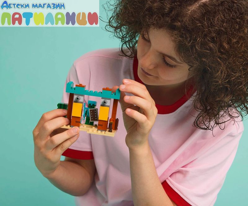 Гейминг играчка с пустинен замък – този малък комплект LEGO® за деца е пълен с боен екшън от Minecraft® за опазването на бъчва, пълен със съкровища;
