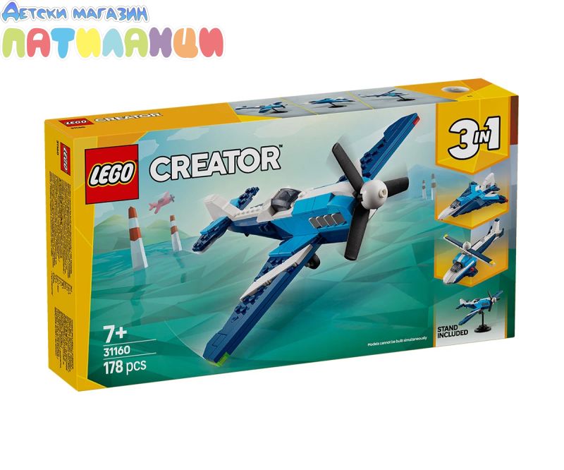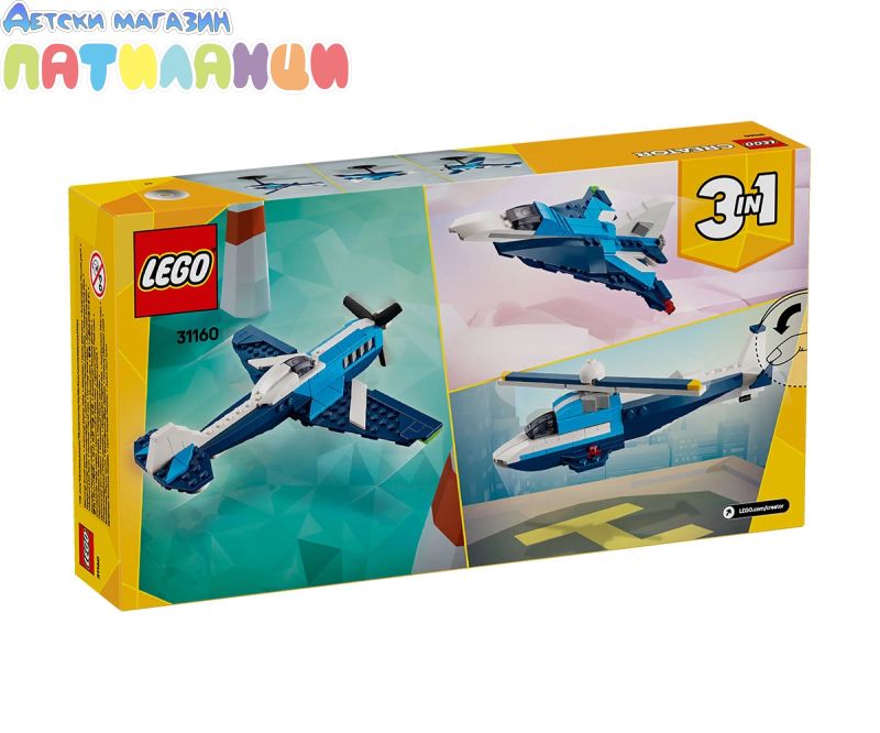 Супербързи приключения в небето очакват момчето и момичето на възраст над 7 години с комплект играчки LEGO® Creator „3 в 1“ Летателни средства: състезателен самолет (31160). Моделът на самолета има въртящо се витло отпред, подвижни колела, за да може да се движи по земята, и стойка за показване от тухлички. Децата може да избира между построяването на 3 различни страхотни превозни средства: самолет с въртящо се витло и подвижно колело, реактивен самолет с подвижно колело и модел на хеликоптер с въртящи се роторни перки. Всеки модел може да бъде изложен на стойка от тухлички, а комплектът е впечатляващ подарък за деца, които обичат да разиграват въображаеми екшън истории. Комплектът LEGO Creator „3 в 1“ със страхотни подаръци за деца с 3 различни модела, които да създавате и променяте, във всяка кутия. Тези трансформиращи се комплекти играчки „3 в 1“ им позволяват да се насладят на въображаема игра и да предлагат впечатляваща гама, за най-големите им подходящи увлечения, включително супер готини превозни средства, невероятни животни и детайлни къщи. Имайте възможност, че моделите не бъдат предвидени да бъдат построени едновременно.