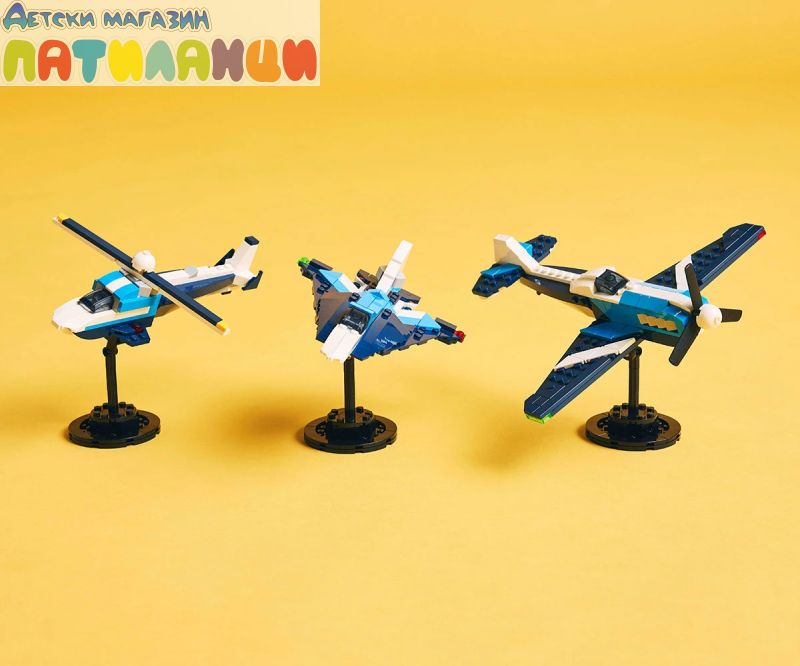 Полетете към небето за вълнуващ въздушен екшън с 3 различни превозни средства! Носете се през облаците със страхотен състезателен самолет с витло. Обратно на земята го промените в супербърз реактивен самолет или впечатляващ хеликоптер с въртяща сероторна перка, преди да излетите отново! С кое превозно средство ще се понесете към небето? Изборът е вашият с този невероятен строителен комплект „3 в 1“!