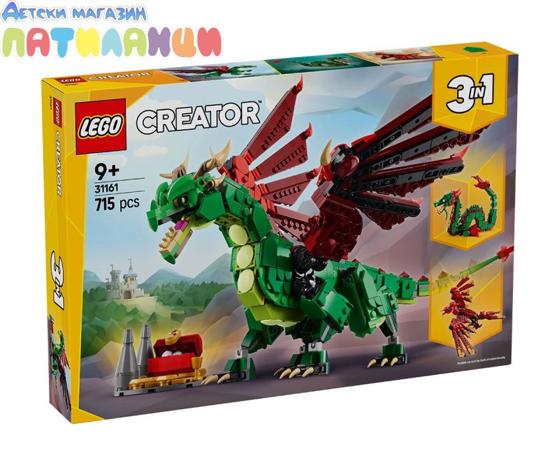 Зарадвайте малките пътешественици във времето с този комплект за игра със създания LEGO® Creator Средновековен дракон (31161). С фигура на дракон, която позволява на момчето и момичето на възраст над 9 години да разиграват вълнуващ средновековен екшън, с чифт големи подвижни крила, които се движат нагоре-надолу и се сгъват и разгъват, както и подвижни глезени, пръсти, шия, челюст , таз и рамене. Има и сандък със съкровища за още повече игра. Феновете на митичните животни могат да построят 3 различни комплекта за игра с един и същ комплект тухлички: подвижна фигура на дракон, подвижна морска змия или подвижн феникс. Всичките 3 митични създания в този комплект променящи се играчки са страхотен подарък за рожден ден за деца. Комплектите LEGO Creator „3 в 1“ вдъхновяват детското въображение с 3 различни възможности за построяване във всяка кутия, за да могат децата да построяват и променят моделите многократно. Комплектите „3 в 1“ предлагат гама от модели, които задоволяват най-големите им увлечения, включително свои бързи превозни средства, невероятни животни и детайлни къщи. Имайте възможност, че моделите не бъдат предвидени да бъдат построени едновременно.