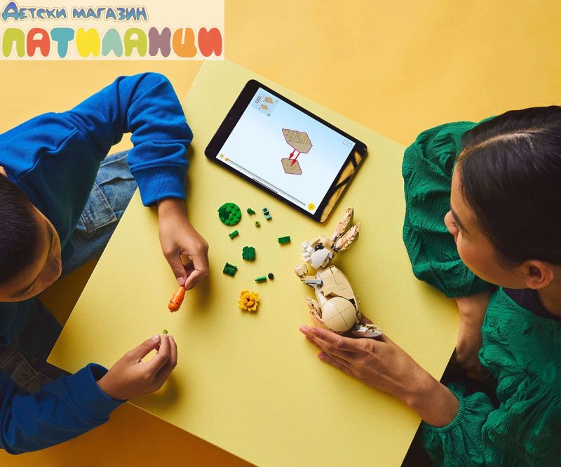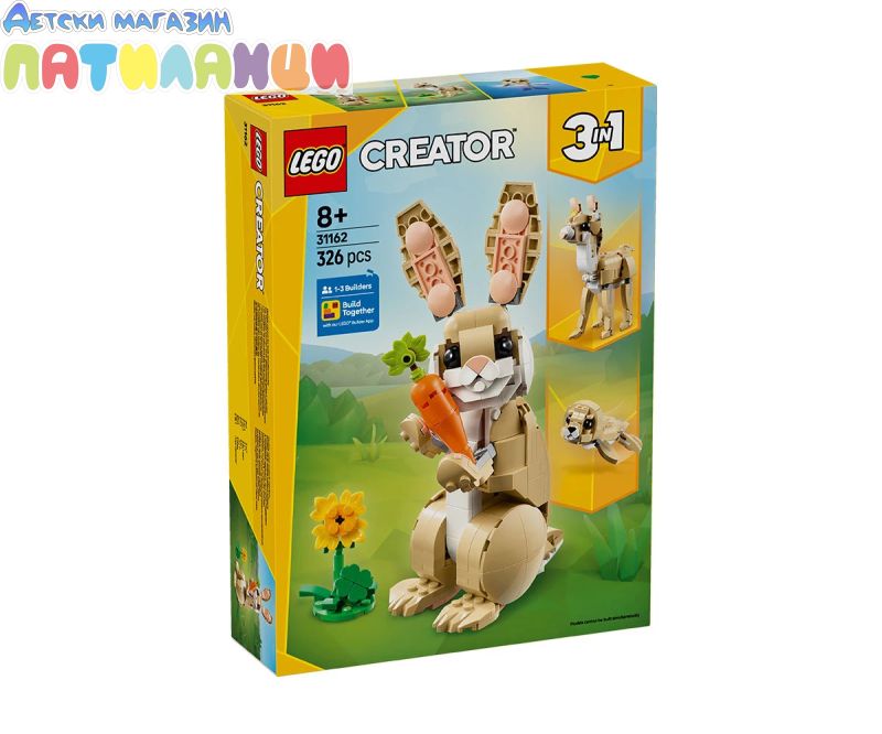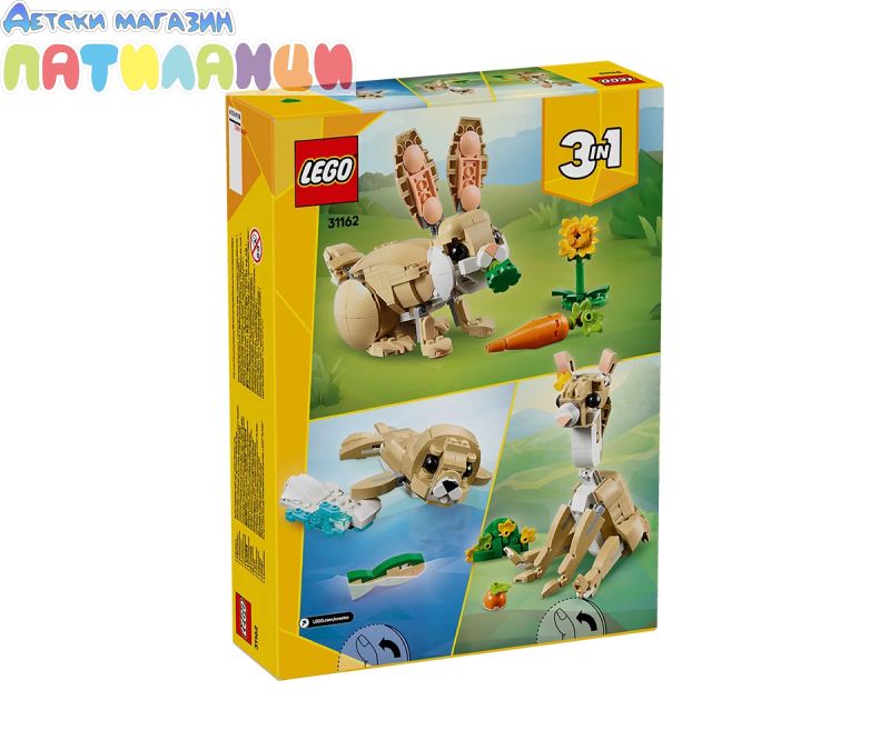Малките любители на животните на възраст над 8 години се наслаждават на забавни приключения с конструктора LEGO® Creator „3 в 1“ Сладко зайче (31162). Комплектът за игра включва зайче с подвижна глава, уши, предни и задни крака, което може да стоина 2 или на 4 крака и се предлага със слънчоглед и морков. Момичетата и момчетата могат да построят три различни комплекта за игра LEGO с животни от едни и същи тухлически: подвижна фигурка на сладко зайче със слънчоглед и морков, подвижна лама със зелен а туфа трева и половина морков и фигура на тюлен с лед и риба. И трите сцени са чудесен подарък за деца за въображаема игра и показване. Комплектът LEGO Creator „3 в 1“ вдъхновява въображението на децата с три различни възможности за построяване във всяка кутия. Те с удоволствие ще построяват и променят моделите многократно. Постройте заедно с приятели и семейството си – приложението LEGO Builder предлага забавно съвместно изживяване при построяването на този комплект. Моля, имайте предвид, че моделите не могат да бъдат построени едновременно.