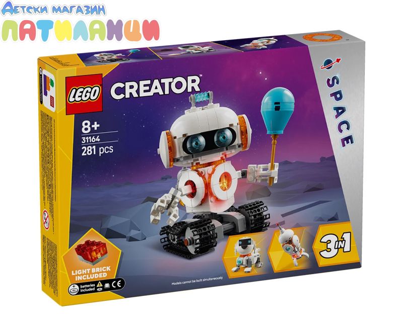Момчетата и момичета на възраст над 8 години разиграват истории сред звездите с този научен комплект за игра LEGO® Creator „3 в 1“ Космически робот (31164). Този робот за деца е добавен на подвижни вериги и има реактивна раница, тяло и глава, която може да се върти, подвижни ръце и пръсти, балон и тухличка за светлина, която осветява гърдите му. Феновете на LEGO построяват и променят 3 различни изпълнения с екшън космически комплект за игра с едни и същи тухлически: робот на подвижни вериги, фигура на космическо куче с кокал и летящ диск или космическа ракета. Всичките три модела са страхотни подаръци на космическа тематика за игра и се показват и се осветяват, когато децата натиснат тухличка за светлина (с включване на батерии). Комплектите LEGOCreator „3 в 1“ са страхотни подаръци за деца с 3 различни модела, които да създавате и променяте, във всяка кутия. Тези трансформиращи се комплекти играчки „3 в 1“ им позволяват да се насладят на въображаема игра и да предлагат впечатляваща гама, подходяща за най-големите им увлечения, включително суперготини превозни средства, невероятни животни и детайлни къщи. Имайте възможност, че моделите не бъдат предвидени да бъдат построени едновременно.