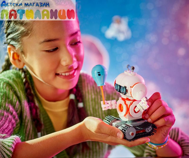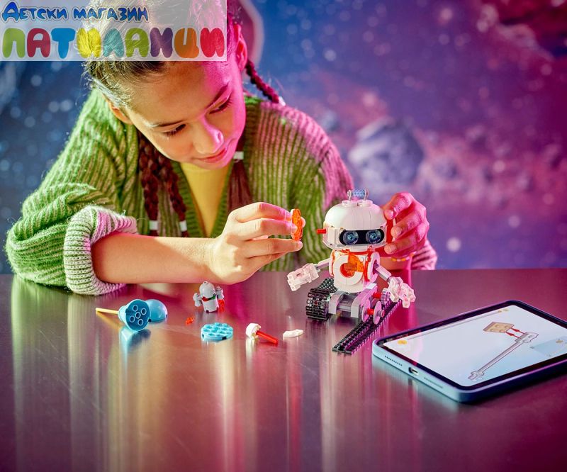 Излетете в космоса за невероятен ексшън сред звездите с 3 различни възможности за построяване. Обходете новата планета със суперготин космически робот с вериги, реактивна раница и балон. Променете го в космическото куче с метален кокал и летящ диск или го превърнете в космическата ракета за още междугалактически приключения. Можете също така да нарисувате тухличка за светлина, за да осветите всеки модел.
