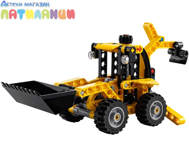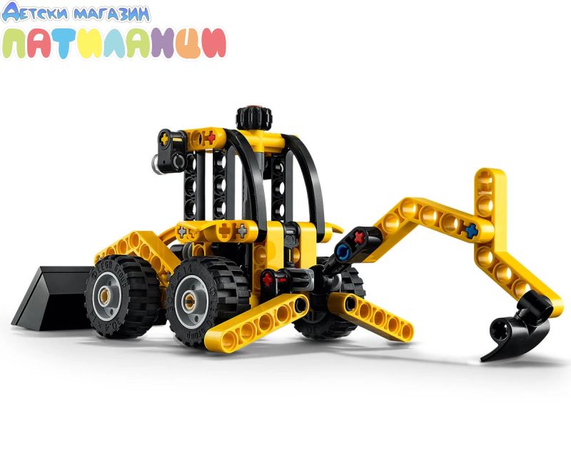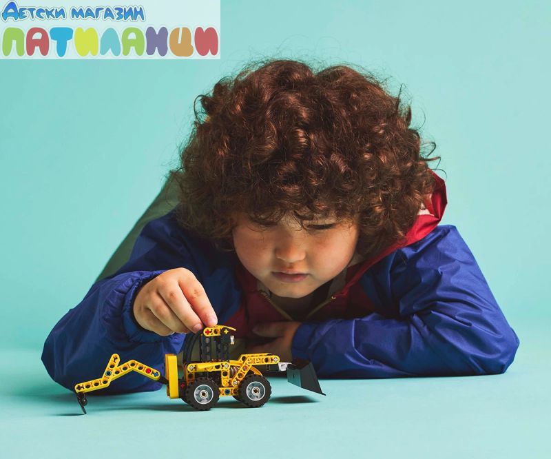 Този детски комплект със строителна играчка включва багер-товарач LEGO® Technic за конструиране с подвижно гребло, опори и заден копач.
