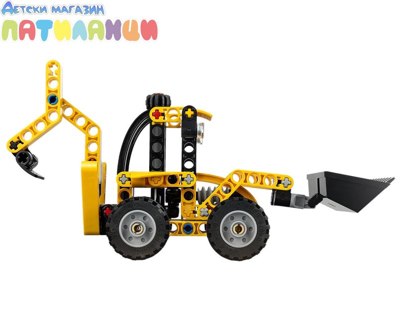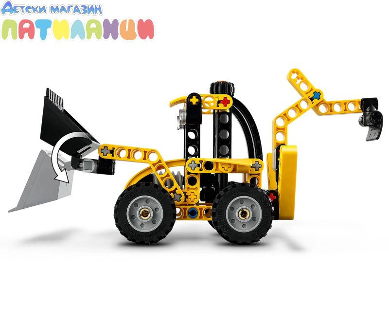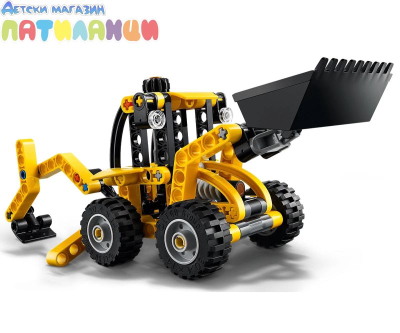 Изпробвайте греблото и копача – моделът на багер-товарач от LEGO® Technic включва гребло, което децата могат да повдигат и пускат с помощта на копчето, заден копач и опори;