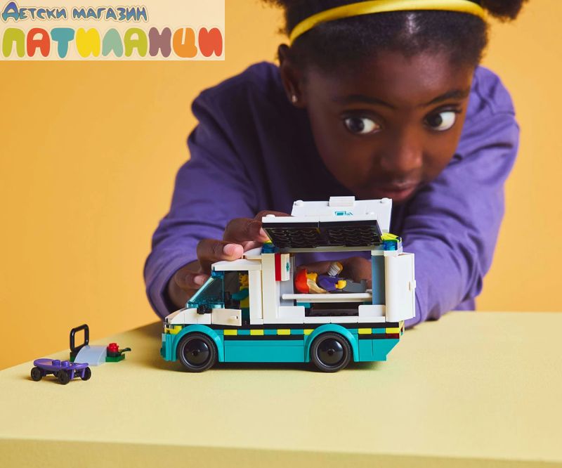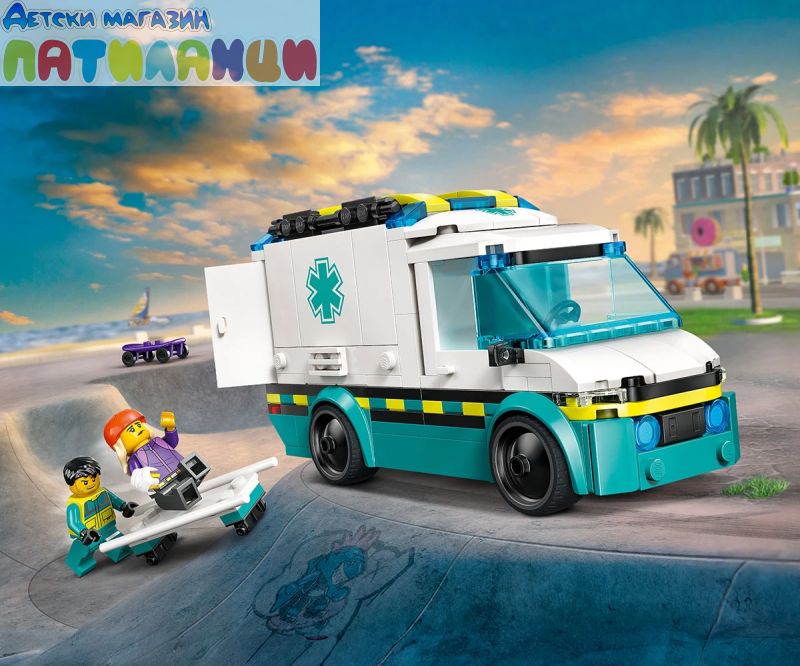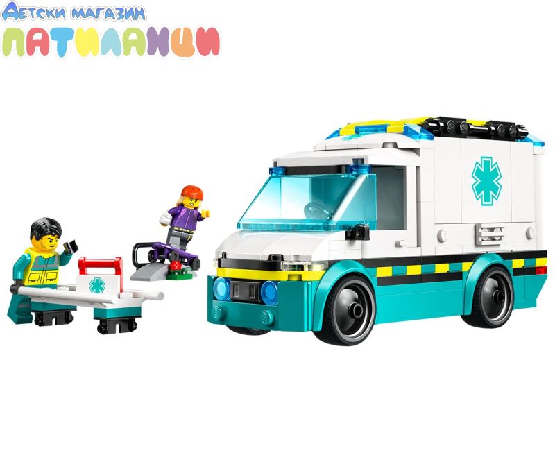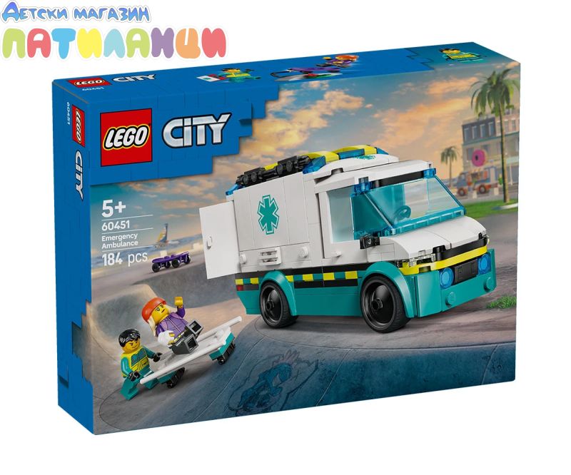 Очаква ви изпълнение с екшън спасителни мисии с играчката LEGO® City Линейка за спешна помощ (60451) за възраст над 5 години. Децата може да сгънат страничните панели и да отворят задните врати за лесен достъп до носилката и медицинското оборудване, включително спринцовка, превръзка и медицинска чанта. Комплектът включва и скейтборд и скейтрампа, плюс минифигури на скейтбордист и парамедик за забавна ролева игра и разказване на историята. Този строителен комплект с камиона включва печатни инструкции за построяване на „стъпка по стъпка“ и 3D инструкции в приложението LEGO Builder, където децата могат да изследват и запазят комплекти за игра, да проследят собствените си напредък в конструирането и да компилират и завъртат, за да коментират моделите от всички ъгли, докато строят. Комплектите за игра LEGO City Great Vehicles предлагат многофункционални земни, въздушни и водни играчки за игра с въображение без ограничения. Децата може да добави тази играчка с транспортно средство за спешна помощ към други комплекти (продава се отделно) от гамата LEGO City за още по-големи приключения!