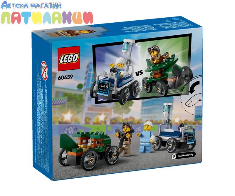 Зарадвайте малките състезателни фенове с LEGO® City Самолет срещу болнично легло: комплект състезателни коли (60459) за деца на възраст над 5 години. Тази забавна състезателна играчка се предлага с две състезателни безмоторни колички и две минифигурки. Децата може да изправи пилота в извисяващия се самолет срещу пациент в изненадващо бързото болнично легло. Кой ще спечели? Заемете мястото си за епично градско състезание! Този комплект LEGO със състезателни безмоторни колички включва печатно ръководство за построяване на „стъпка по стъпка“. Децата могат да се насладят и при забавно строително включване в приложението LEGO Builder, където децата могат да усъвършенстват, да завъртят моделите си в 3D, да следят напредъка си, докато строят, ида изследват и запазват други комплекти за игра. Комплектите за игра LEGO City включват страхотни превозни средства, реалистични структури и забавни герои, които вдъхновяват играта с въображение без ограничения. Децата могат да добавят този комплект с безмоторни колички към други (продават се отделно) от гамата LEGO City, за да разширят света си от възможност за игра.