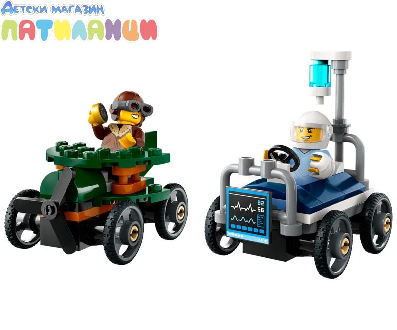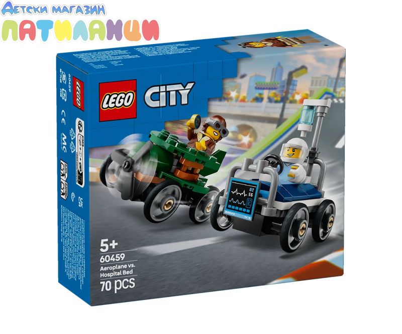 Включете се в невиждан двубой с безмоторни колички със „Самолет срещу болнично легло: комплект състезателни коли“. Градското състезание достига до улиците на LEGO® City със забавни конкуренти! Изправете извисяващия се самолет срещу изненадващо бързото болнично легло и някое състезанието започнете! Кой ще пресече първата финалната линия? Дали ще бъде пилотът или пациентът? Приговете се за ексшън с газ до дупка!